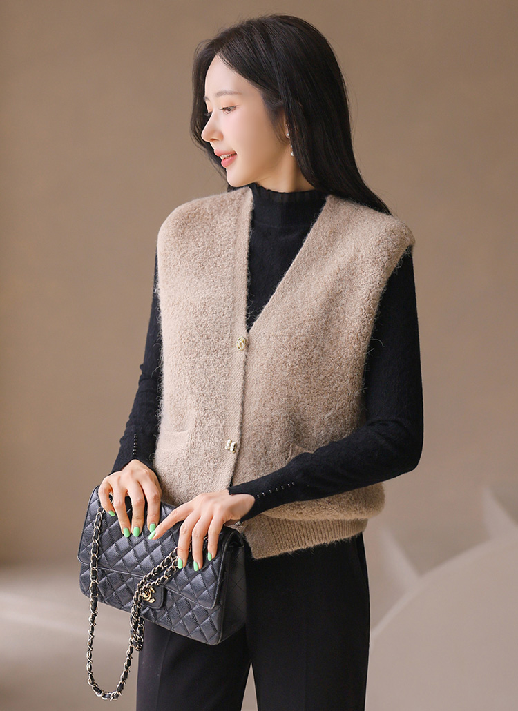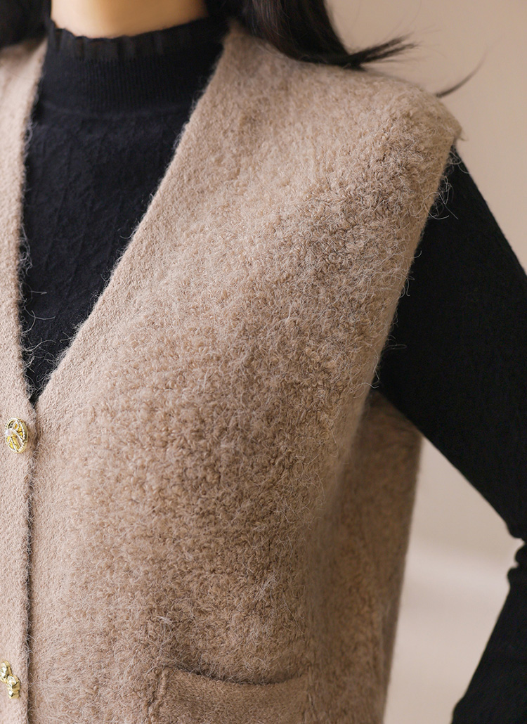 포근한 울 블렌딩 소재에 골드 버튼으로 포인트를 준 뽀글뽀글 니트 조끼에요 :)