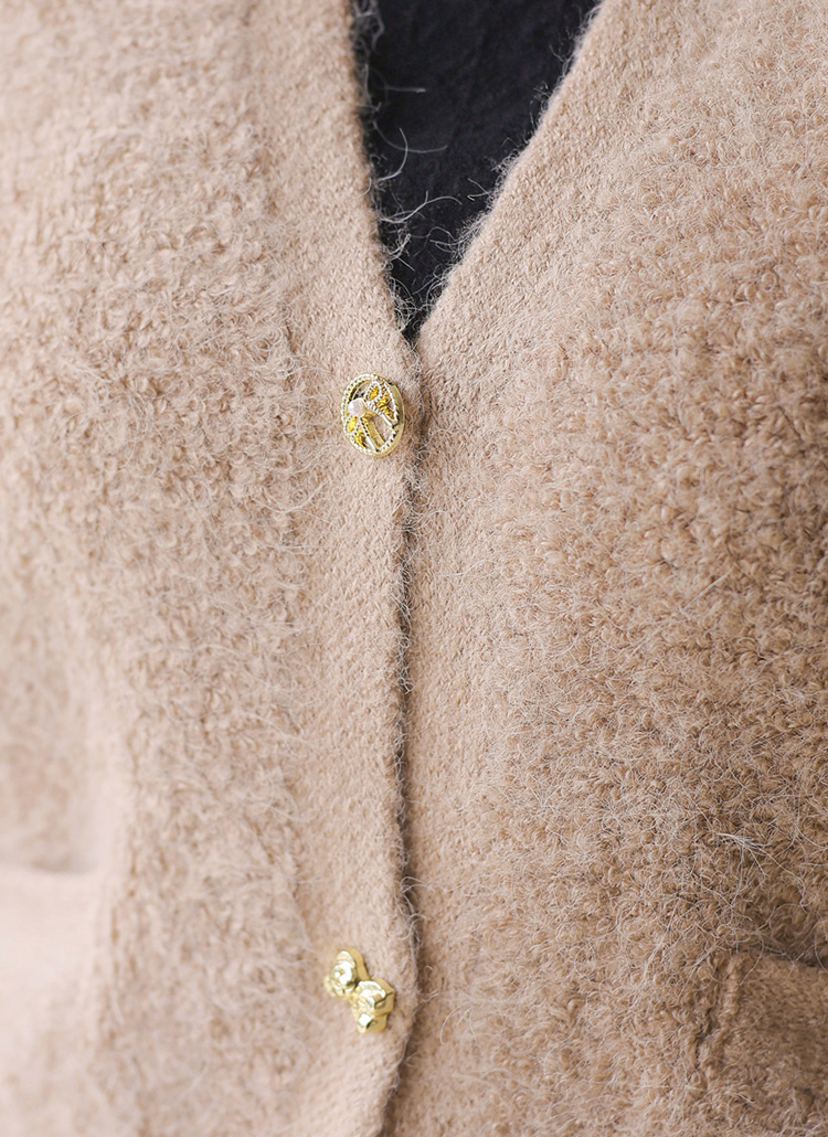 [Soft and cozy fuzzy knit with elegant gold buttons and mini pockets. Lightweight yet warm, perfect for layered fall and winter looks.]