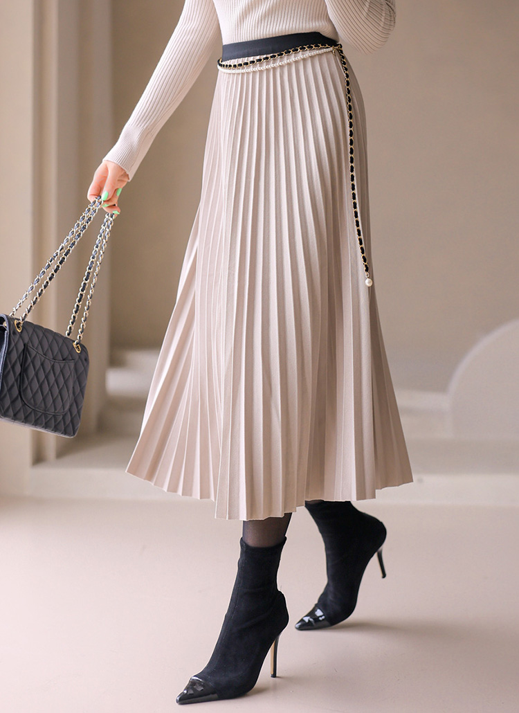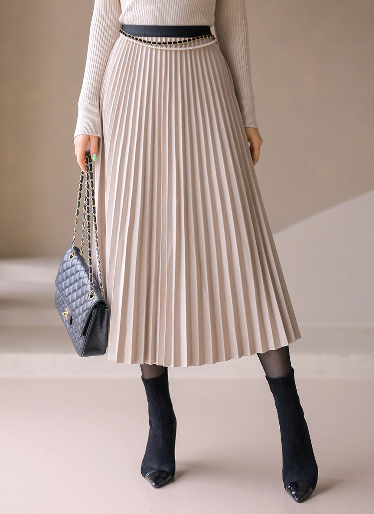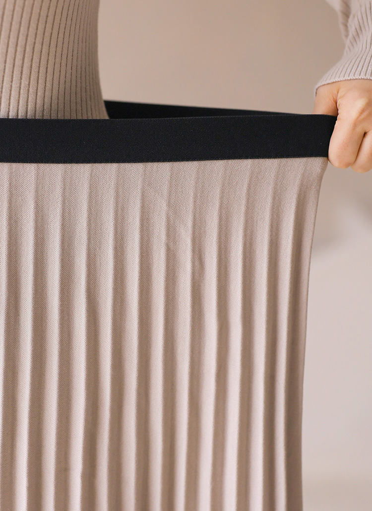 [Soft wool-like texture with a thick, cozy feel. The flowing pleats and stretch waist offer timeless elegance and effortless comfort.]