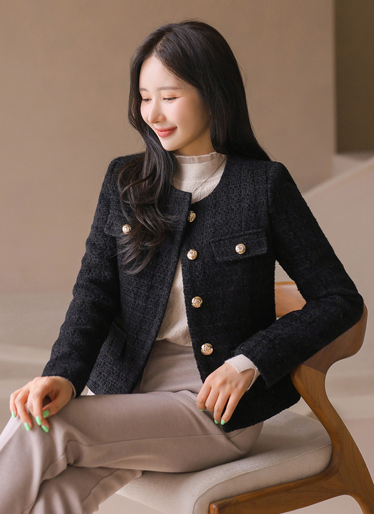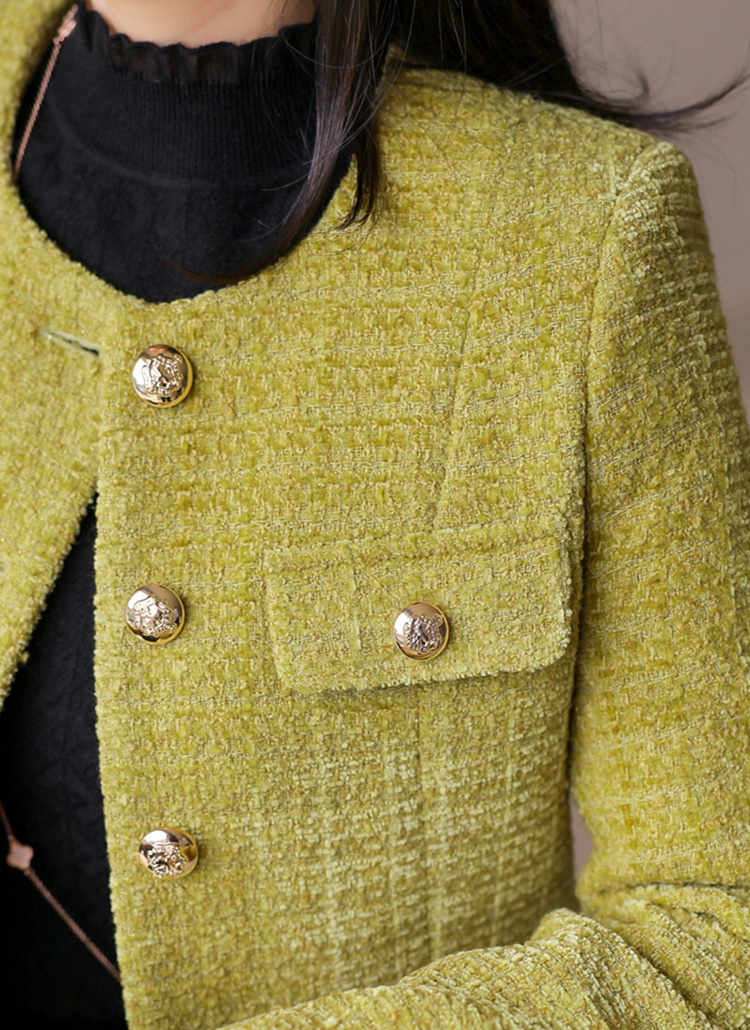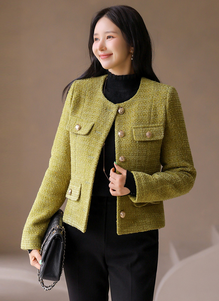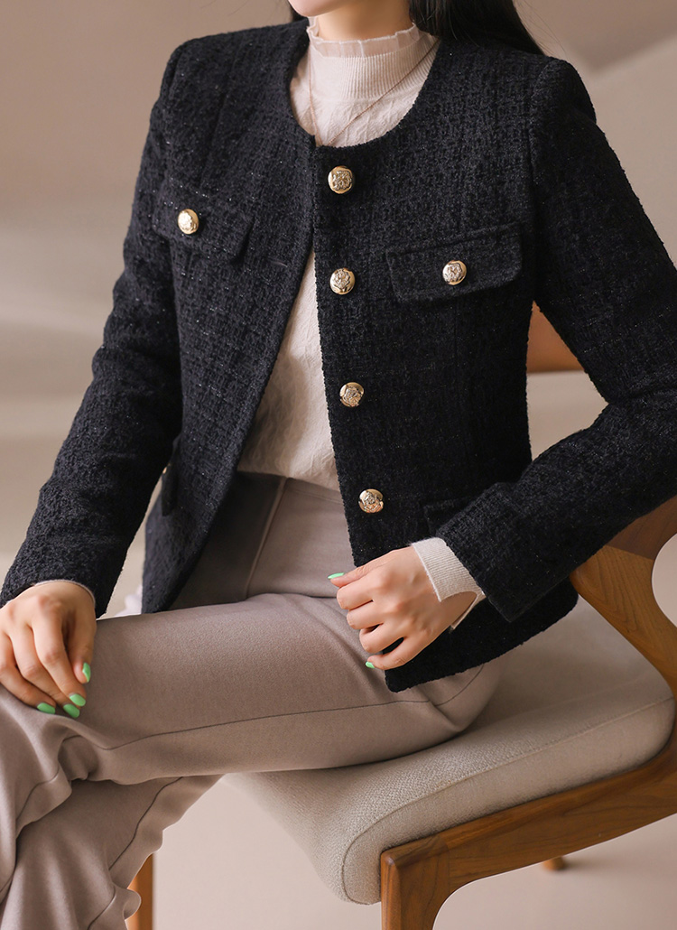 [LouisAngel] Wool30 Collarless Gold Button Metallic Tweed Jacket_Black & Olive Green