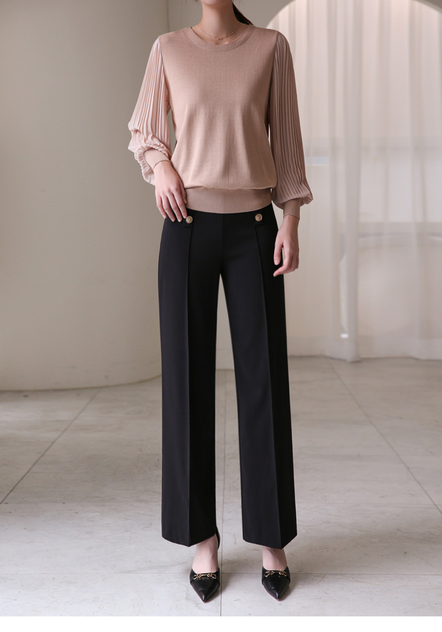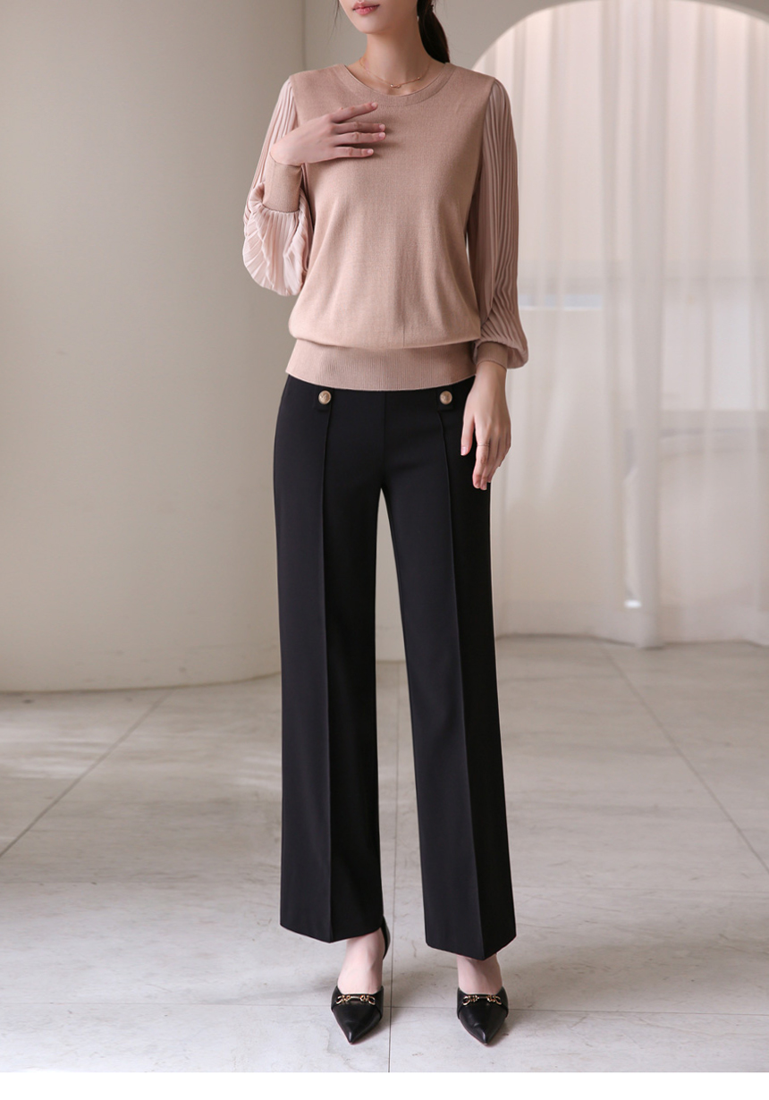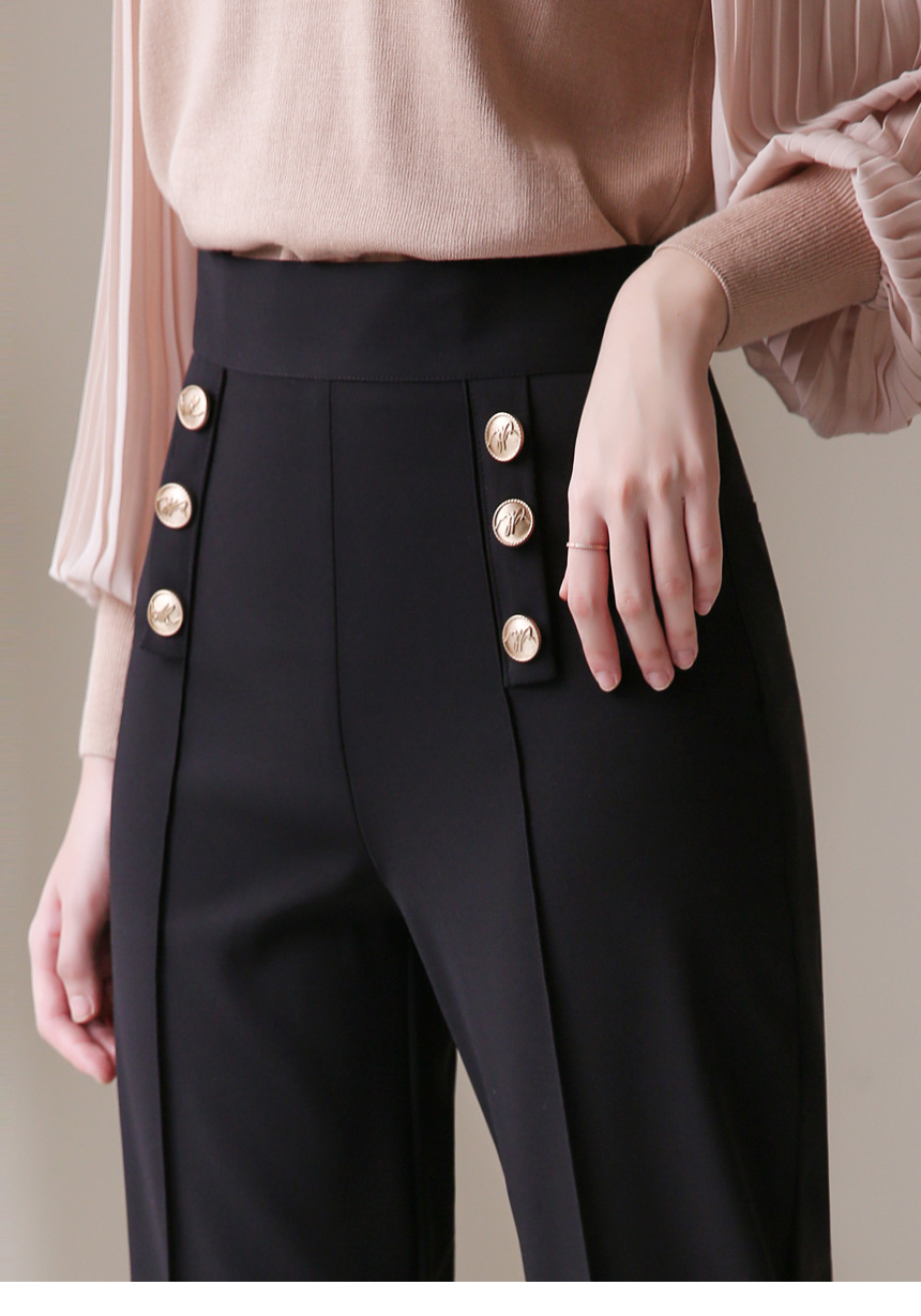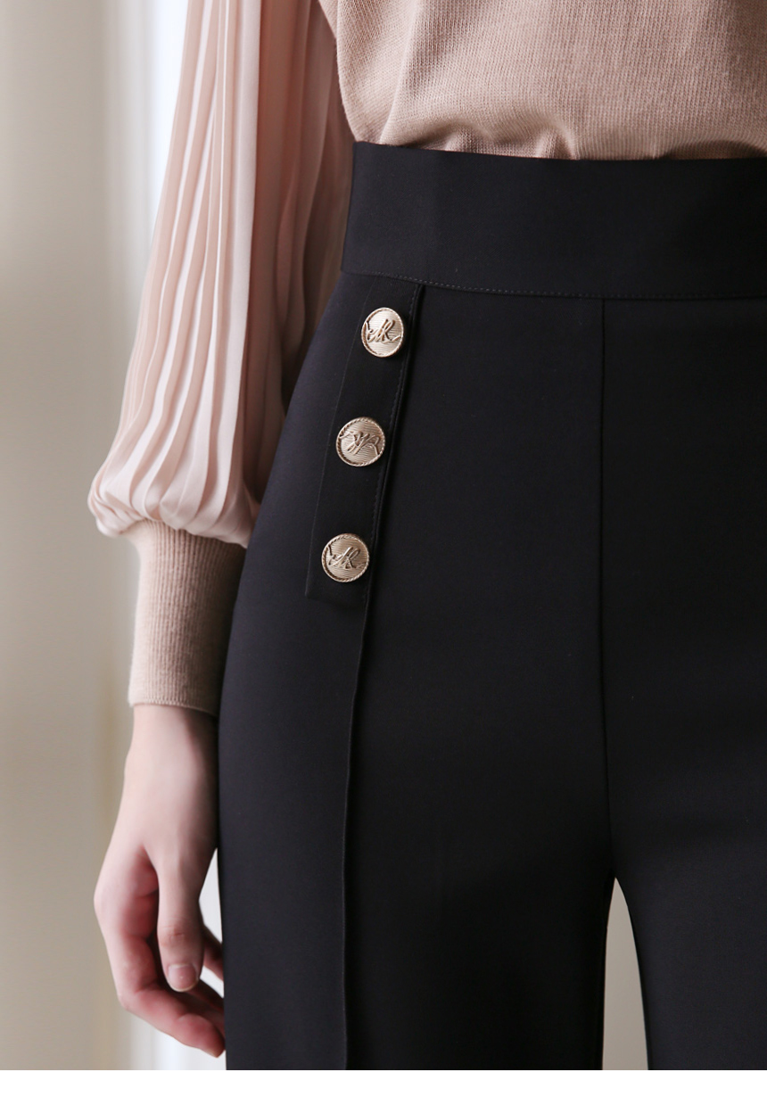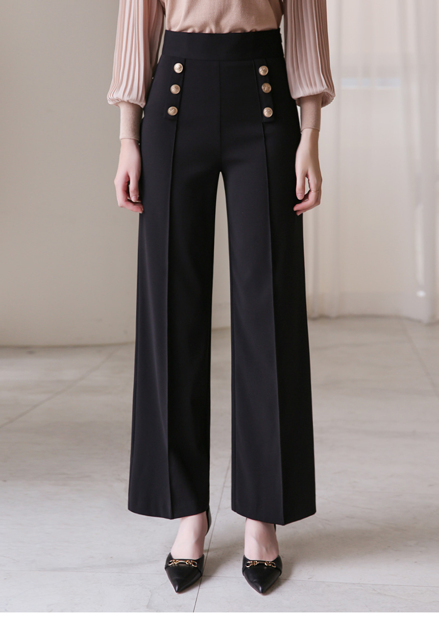 [Elegant wide-leg slacks adorned with gold buttons. Crafted from silky draping fabric for a sleek, elongated leg line and comfort.]