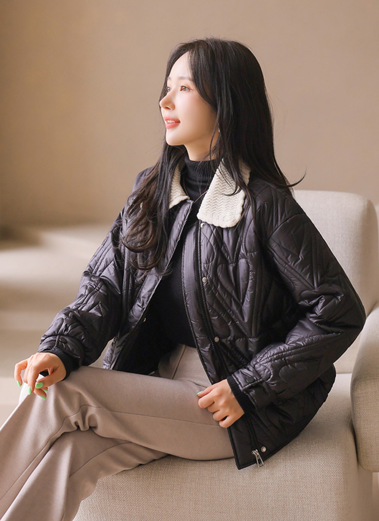[Adorable heart quilting with a soft knit collar. Lightweight yet warm with eco wellon padding for cozy everyday wear.]