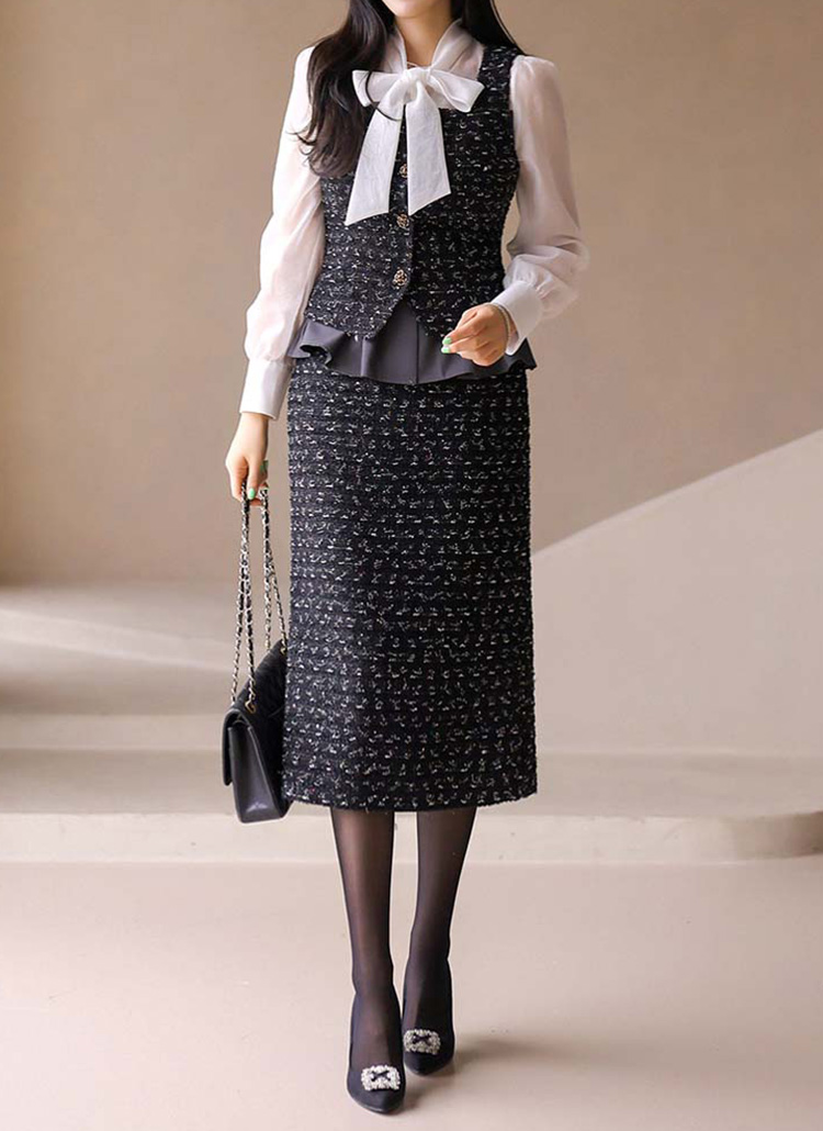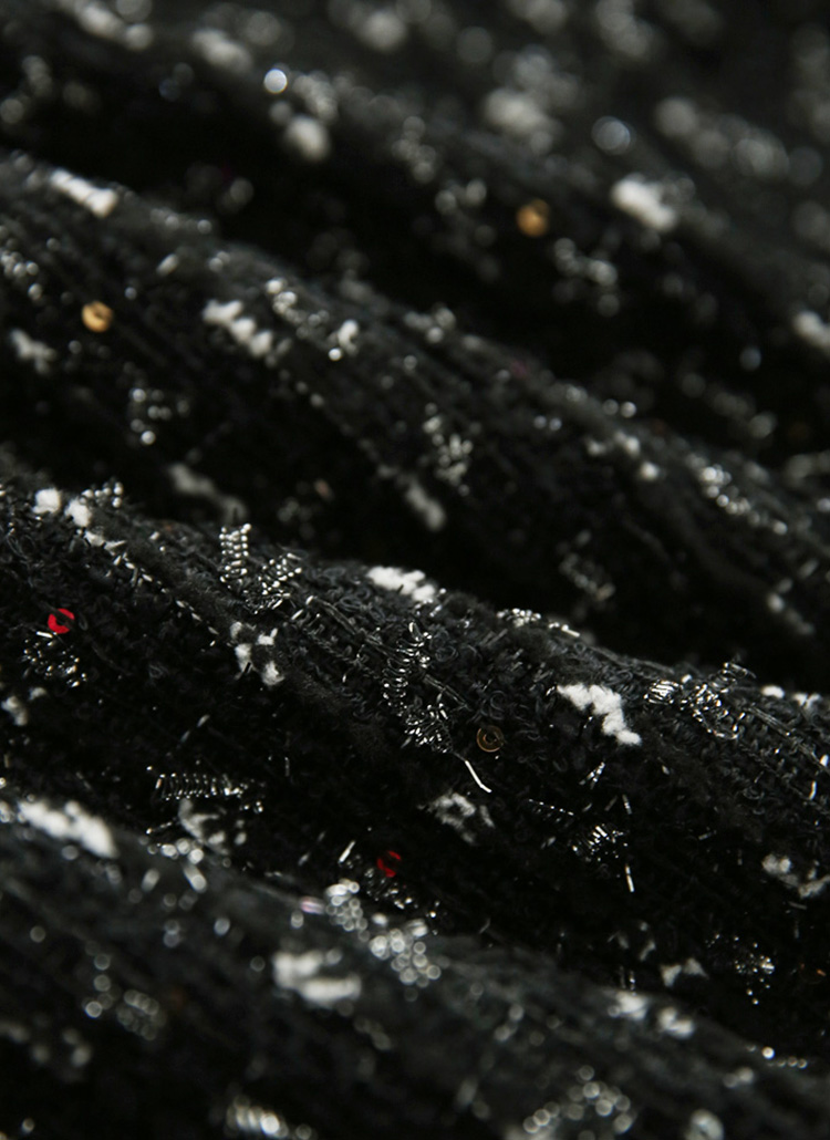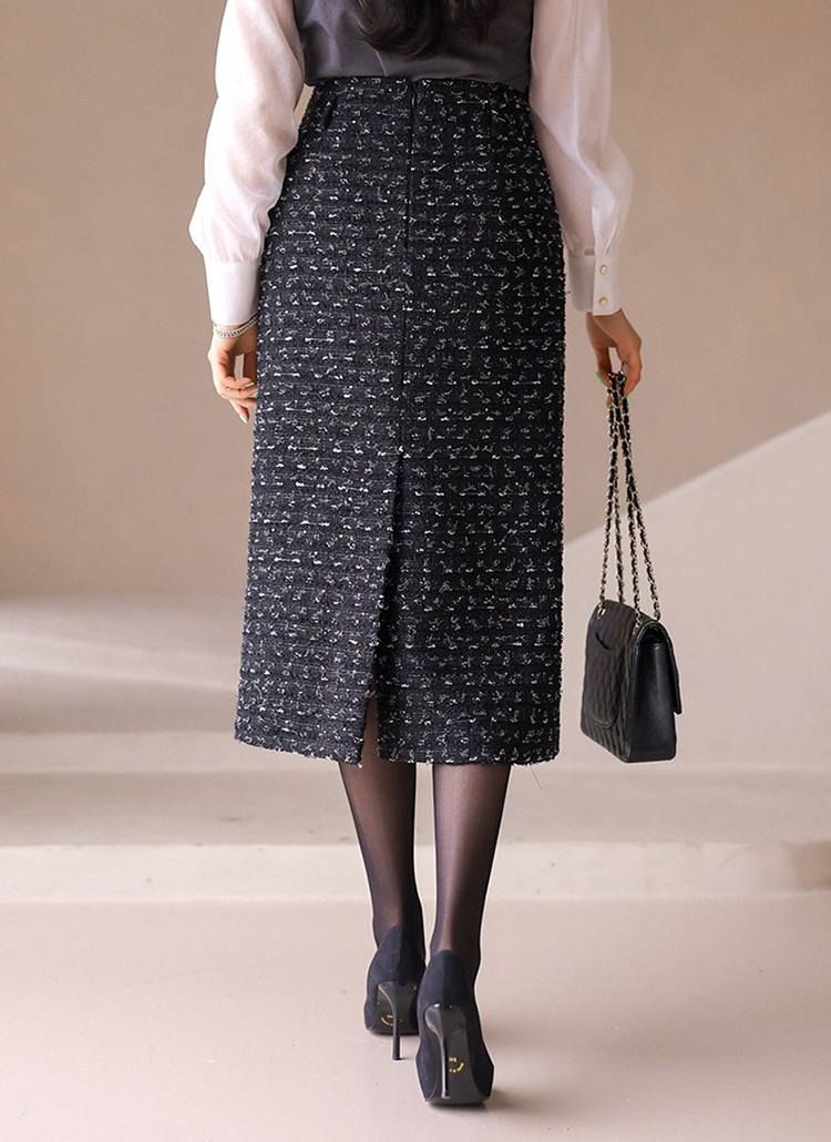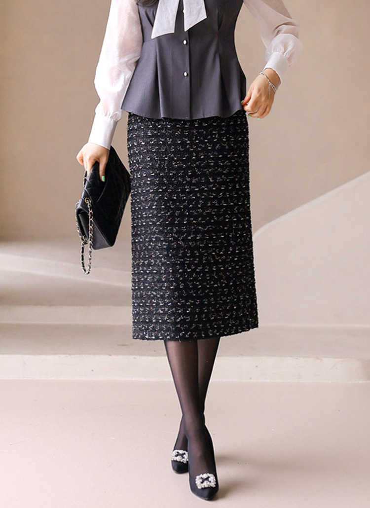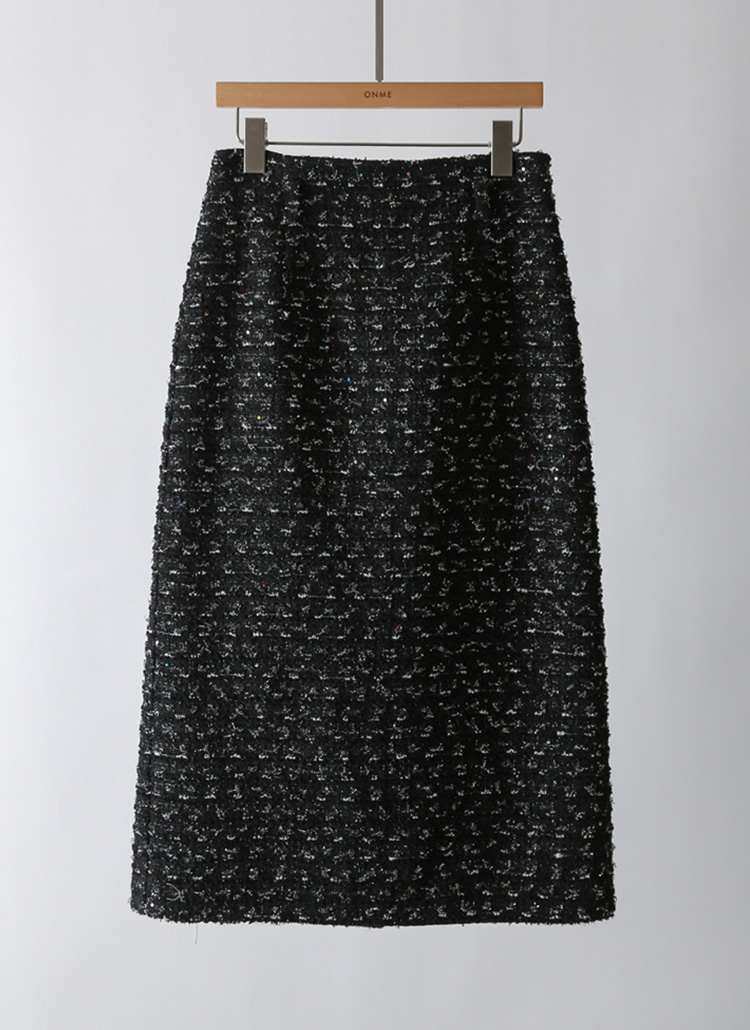 [This black tweed skirt sparkles subtly with sequin accents. Its tailored H-line cut and back slit balance elegance and easy movement.]