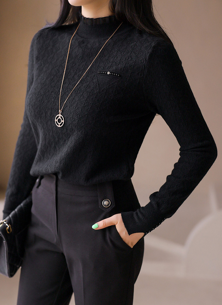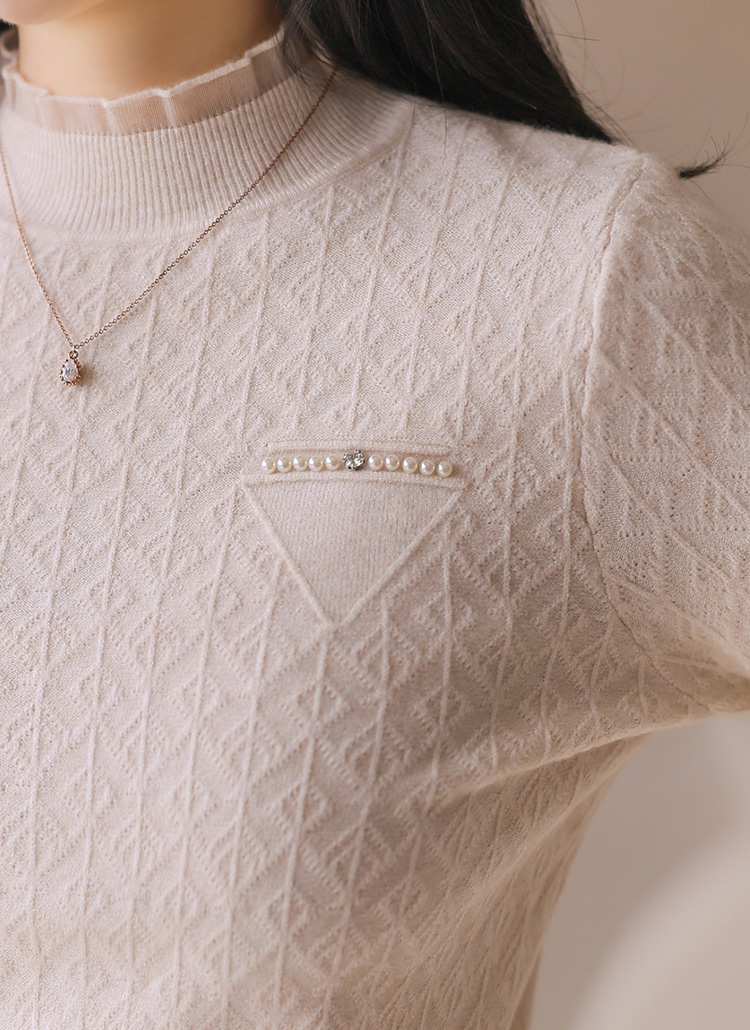[A graceful textured knit featuring a sheer frill neck and pearl-trimmed accent. Warm, stretchy, and perfect for refined daily wear.]