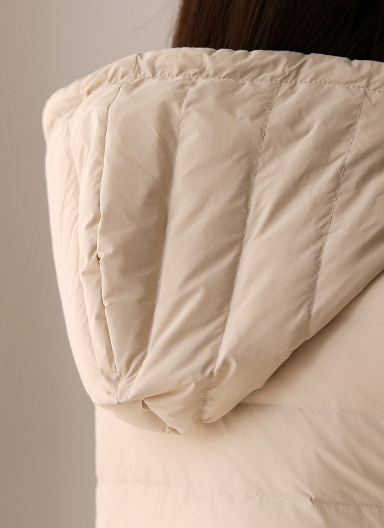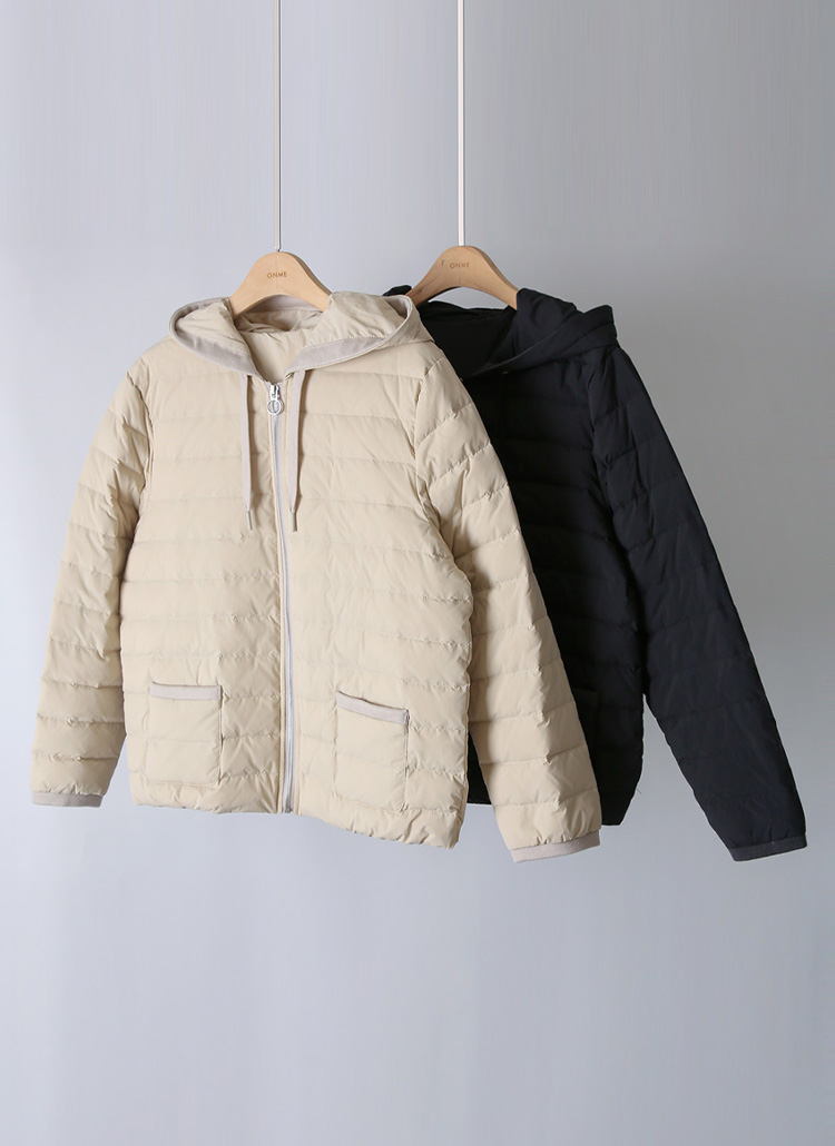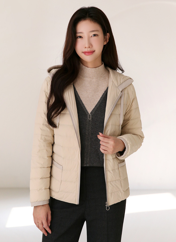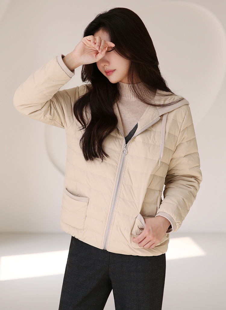 [A lightweight duck-down puffer with a casual hooded zip-up design. Soft, warm, and perfect for effortless everyday layering in cool weather.]