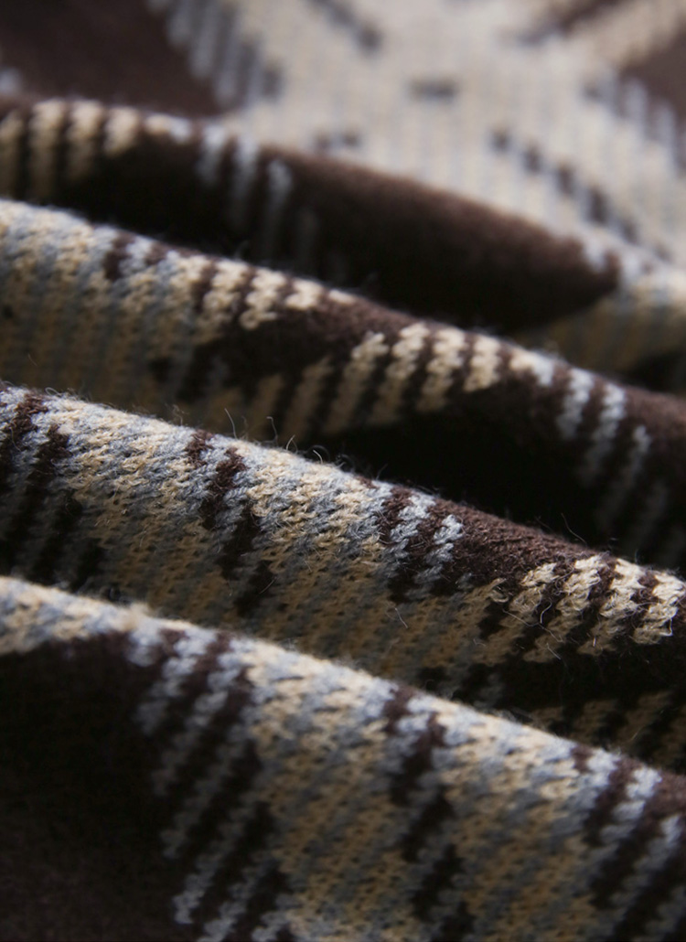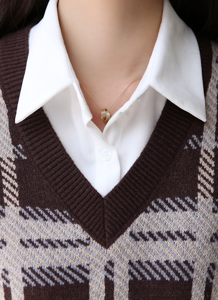 [A warm two-piece featuring a soft corduroy shirt and check knit vest. Cozy yet polished, perfect for stylish fall-to-winter layering.]