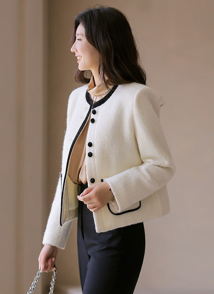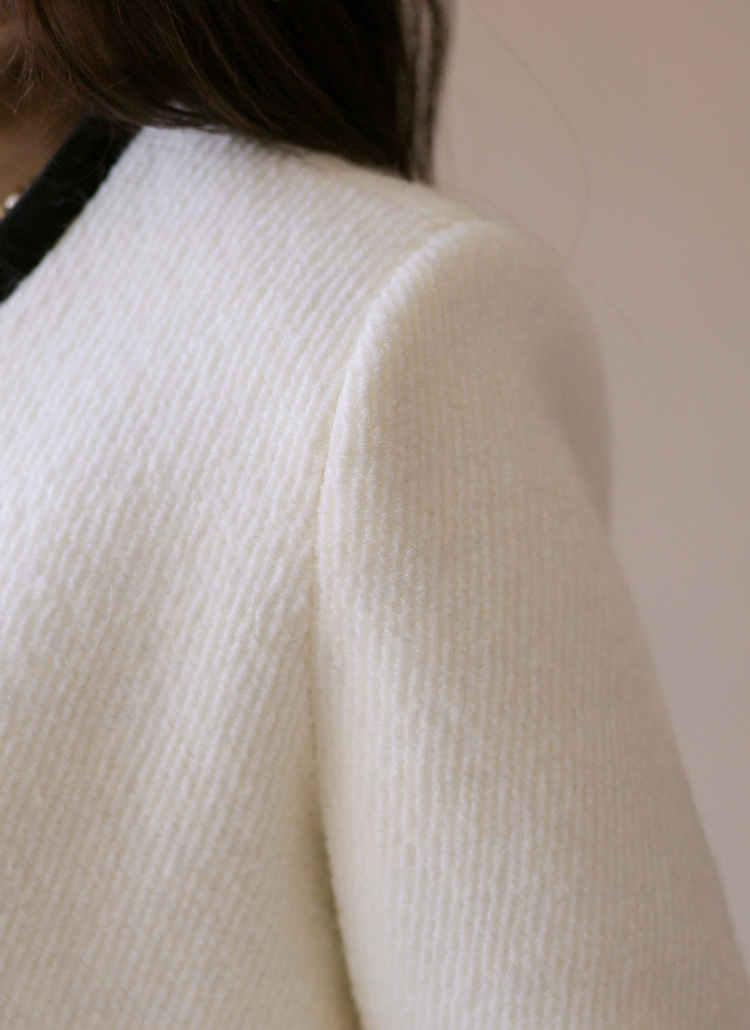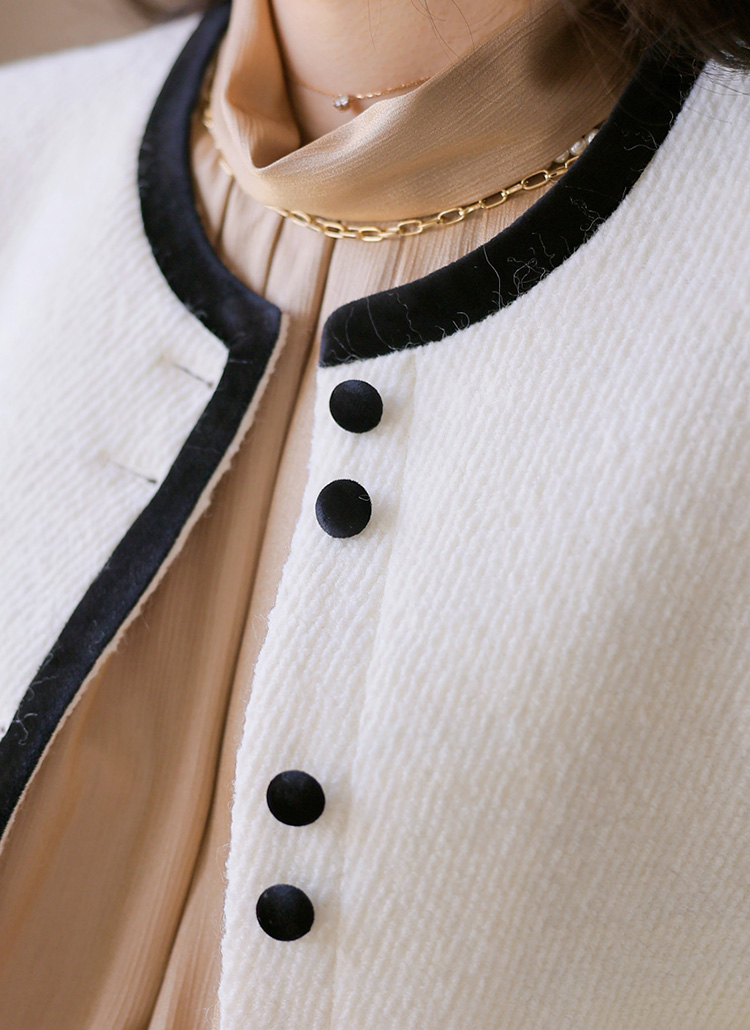[A refined collarless jacket in soft wool blend with velvet piping. Its semi-crop length adds modern polish to any timeless look.]