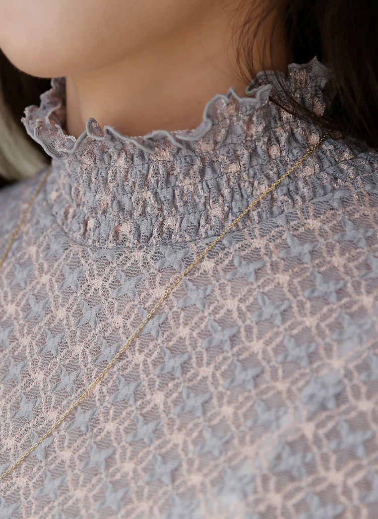 [Delicately sheer with soft smocked frill trims, this lace tee creates a graceful, romantic mood—beautifully versatile as both top and layering piece.]