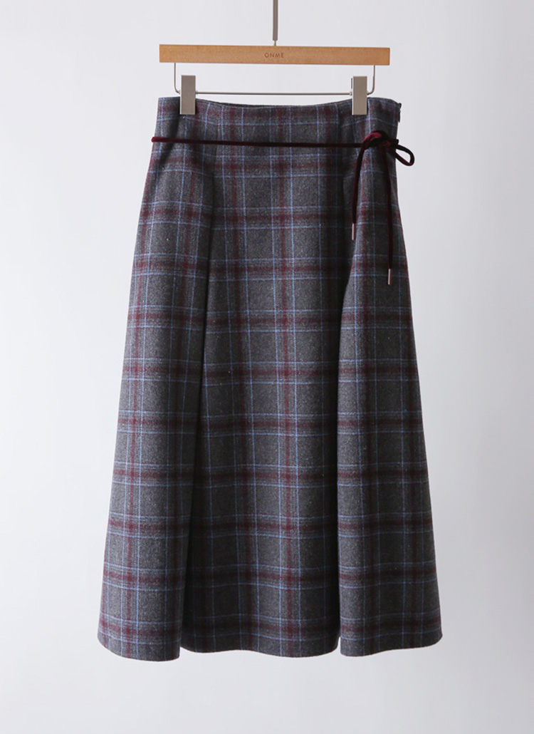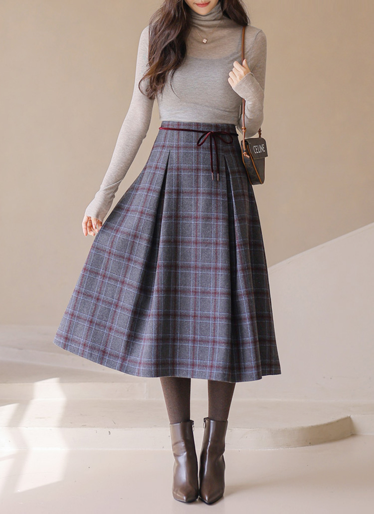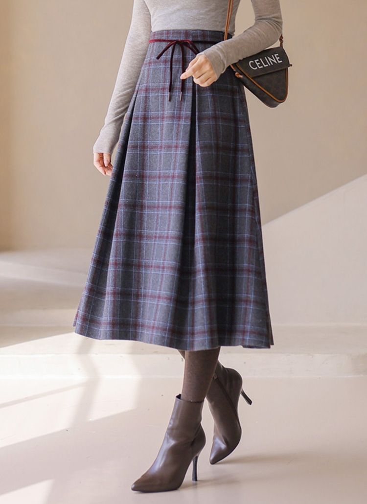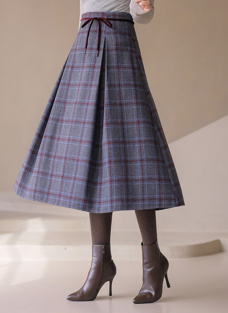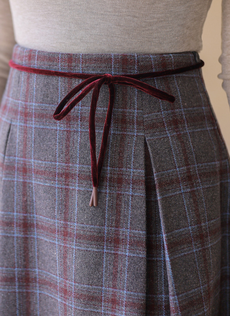 [LouisAngel] Check Pleated Midi Wool Skirt w/ Sash