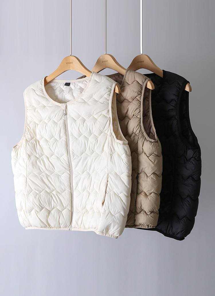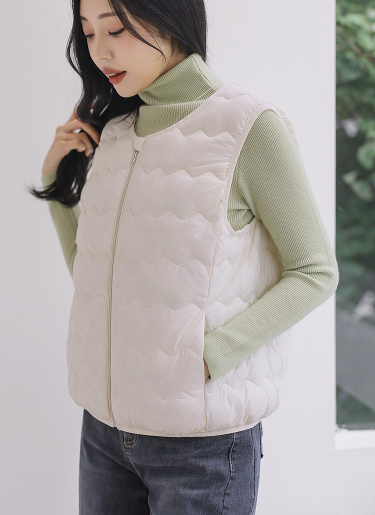 [A sleek lightweight padding vest with soft wave quilting that adds texture and warmth—perfect for layering under coats or knits.]