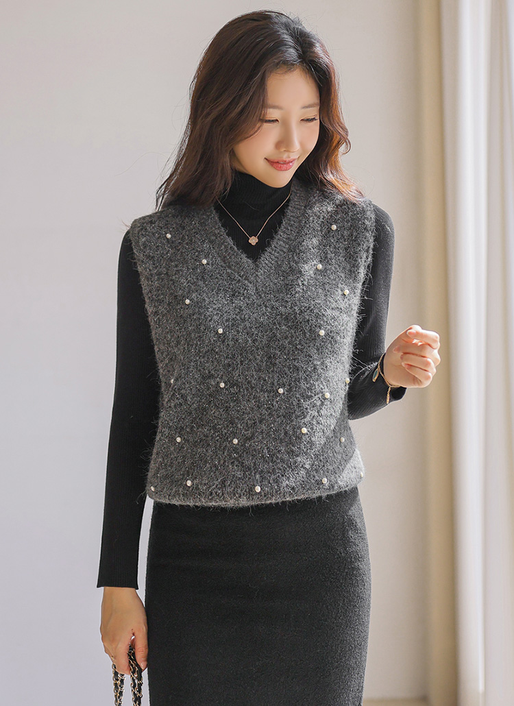 포근한 부클 소재에 진주와 스팽글 디테일로 화사함을 더한 니트 조끼에요 :)