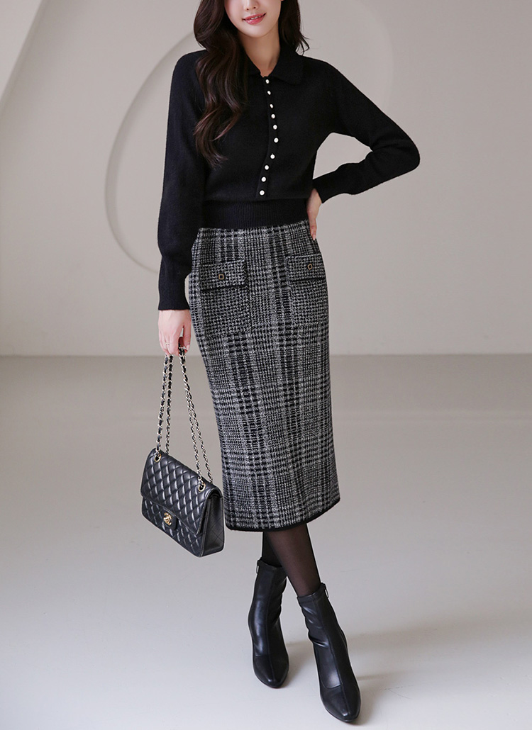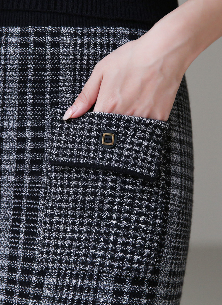 [A soft knit skirt in warm tartan checks, styled with front pocket accents and a slim H-line fit that flatters every silhouette.]