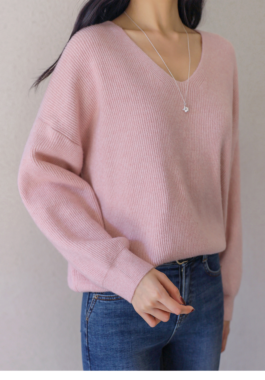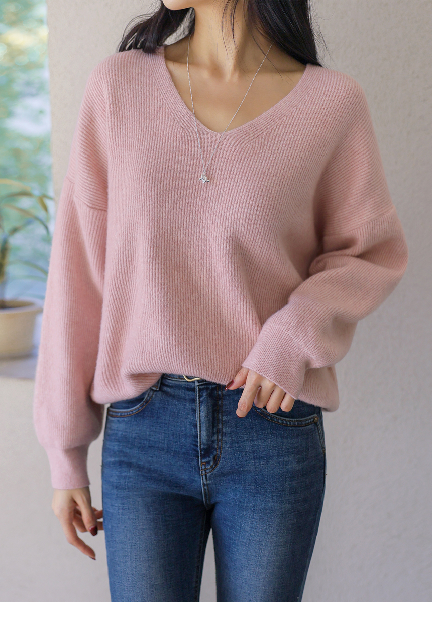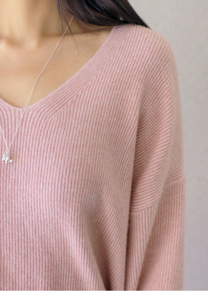 [Warm and plush with a soft rib texture, this loose-fit V-neck sweater flatters the neckline and pairs beautifully with any seasonal look.]