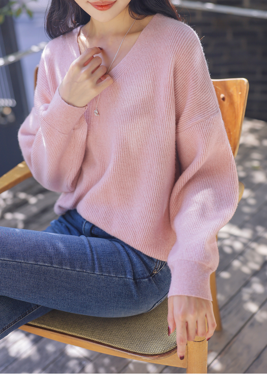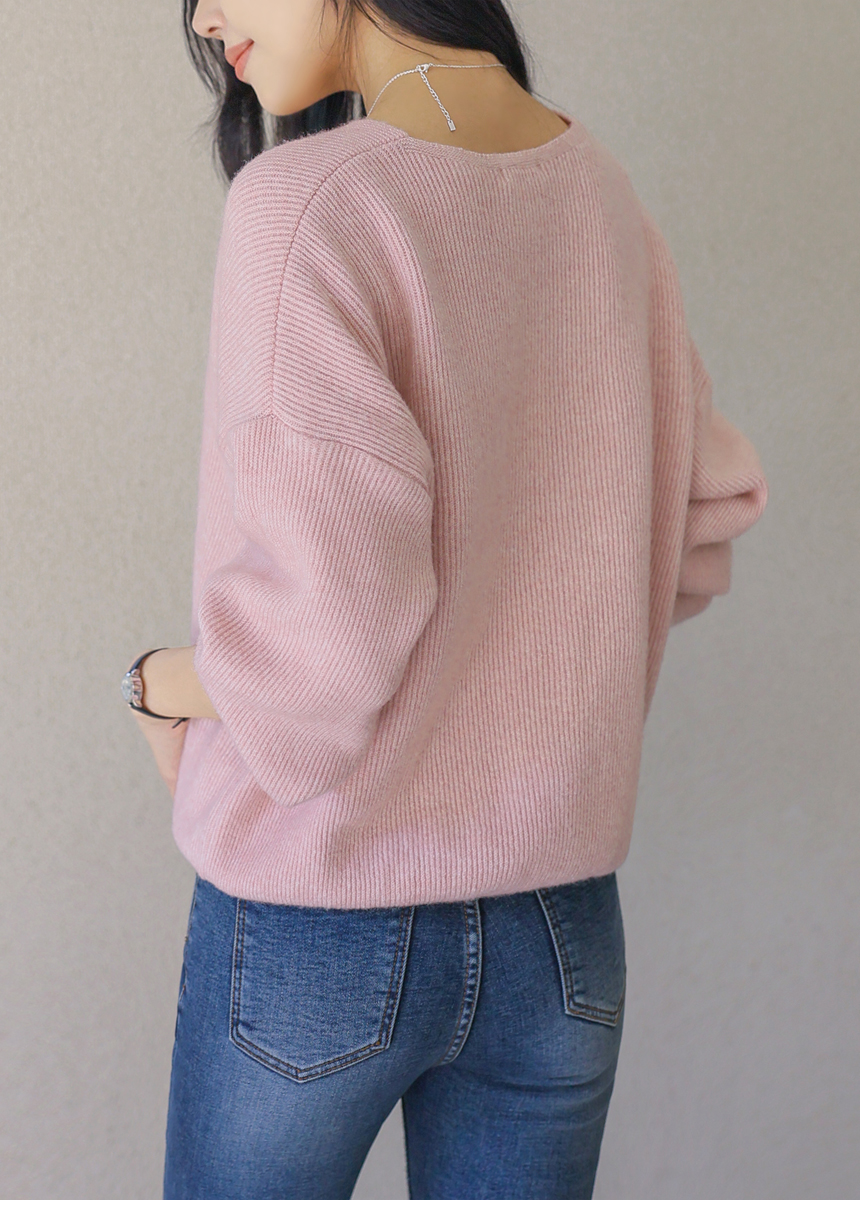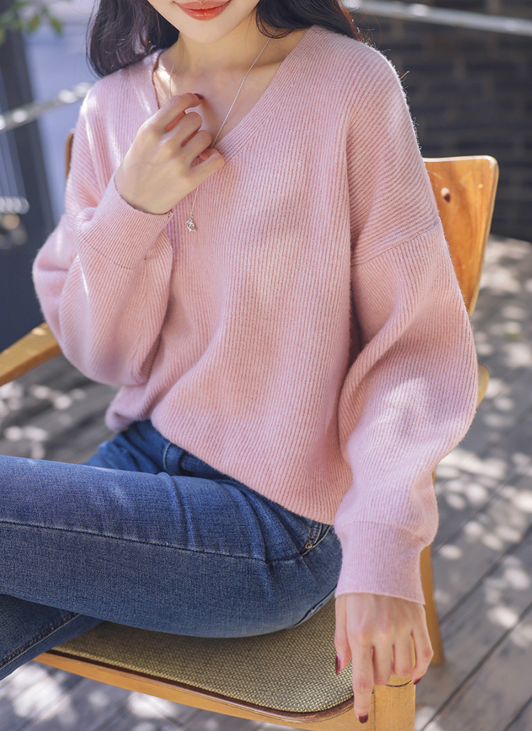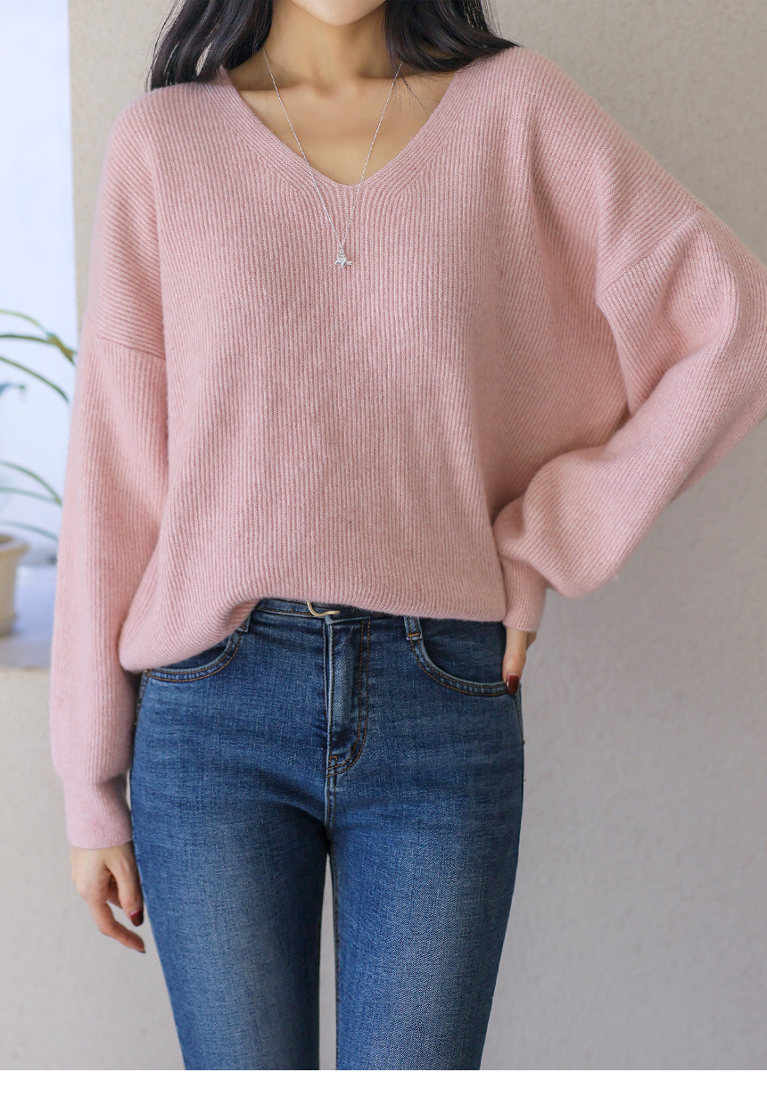 [Warm and plush with a soft rib texture, this loose-fit V-neck sweater flatters the neckline and pairs beautifully with any seasonal look.]