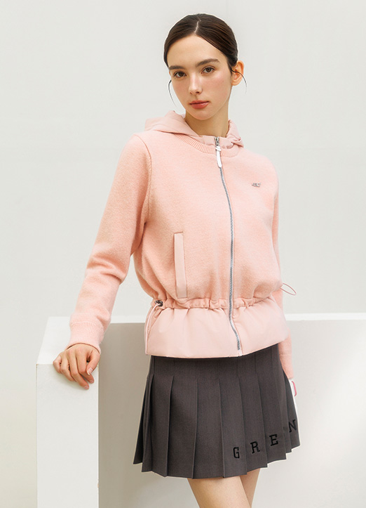 [A sporty-chic wool-blend hoodie with adjustable waistline and quilted contrast trim, perfect for active and stylish layering.]