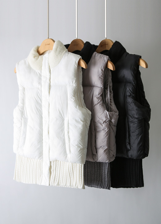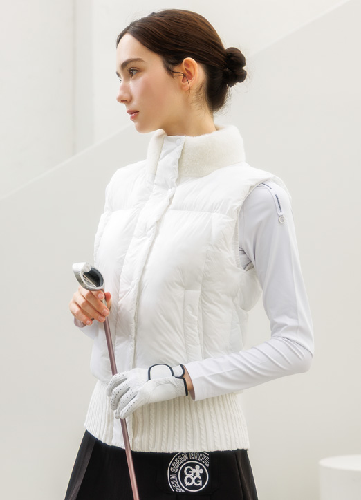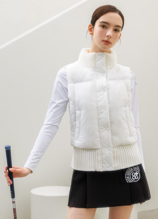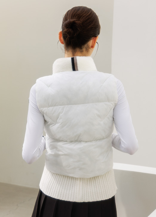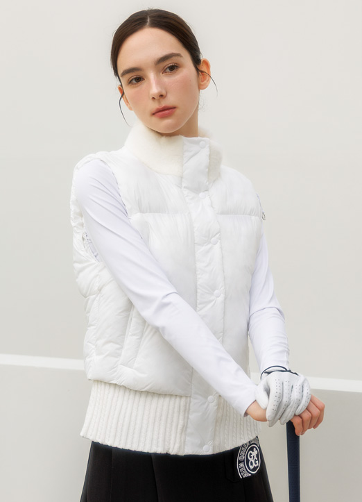[A sporty high-neck vest with faux-fur collar and rib-knit hem, featuring zip and snap closures for sleek warmth on the course or daily wear.]
