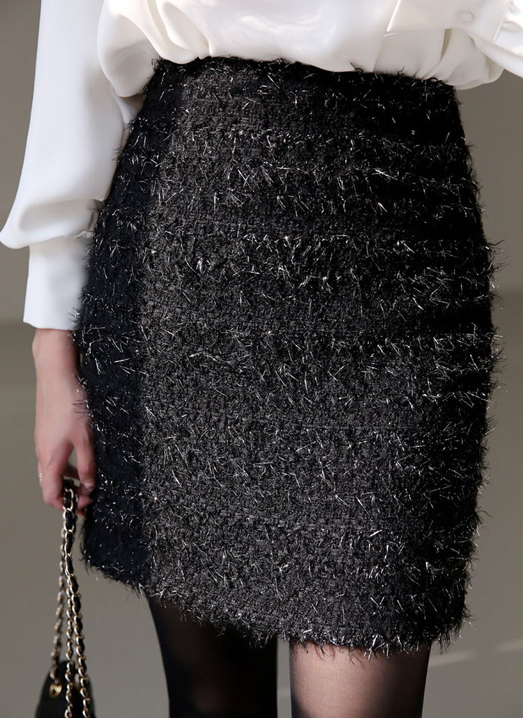 [Featuring a sleek fit with gentle A-line volume, its metallic eyelash texture catches light beautifully for graceful styling.]