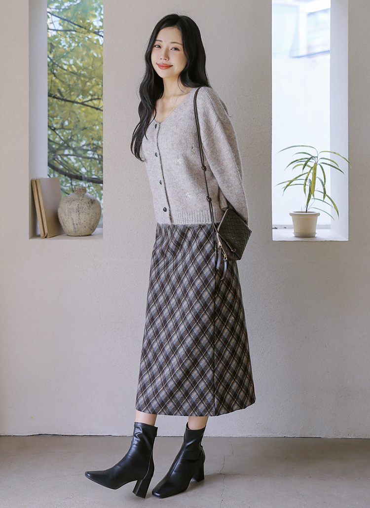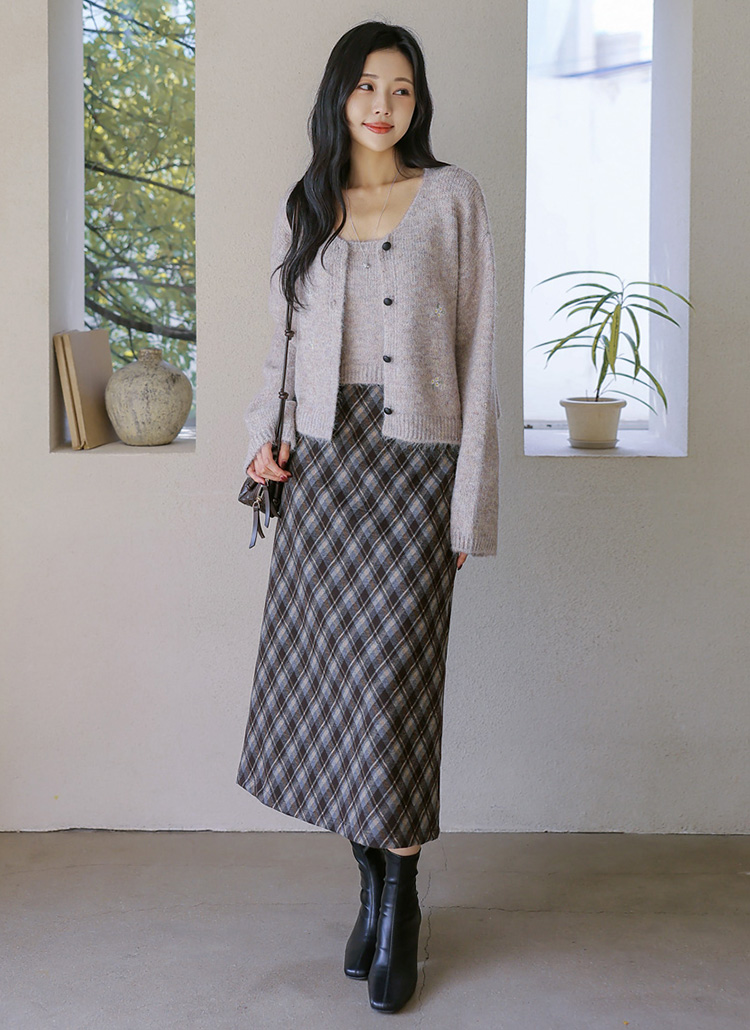 가디건의 세미크롭 디자인이 트렌디한 무드를 연출해주며