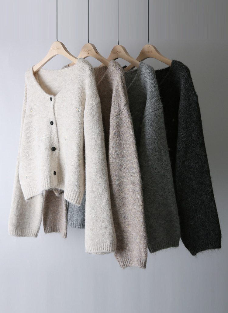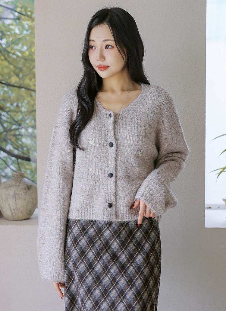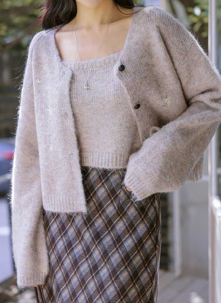 [Soft and fluffy with dainty flower details, this cardigan and cami duo creates a sweet, relaxed silhouette with gentle warmth.]