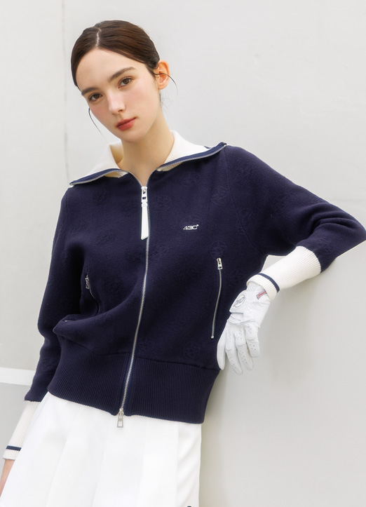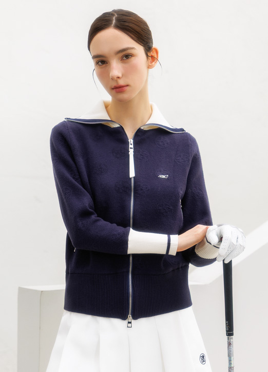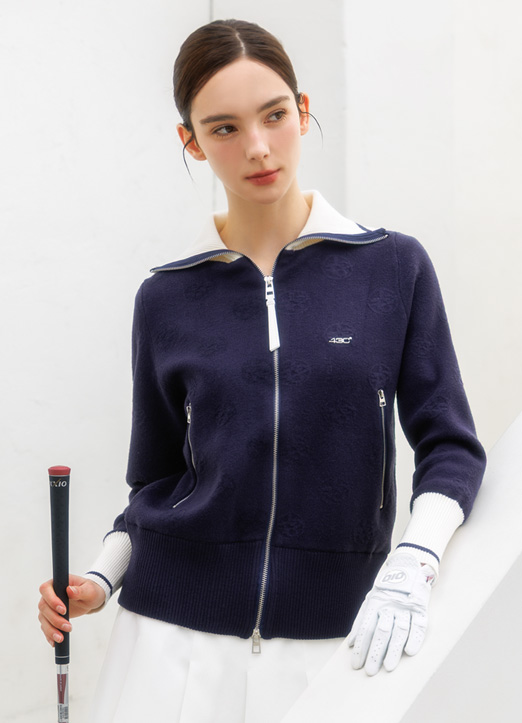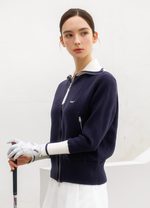 [Soft wool-blend cardigan with subtle jacquard texture, contrast collar, and windproof lining for a refined sporty finish.]