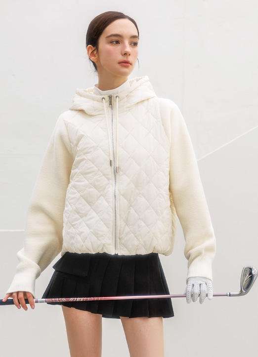 [A cozy blend of quilted padding and knit sleeves, this zip-up hoodie offers lightweight warmth and a soft, feminine silhouette.]