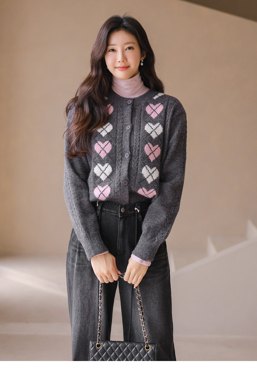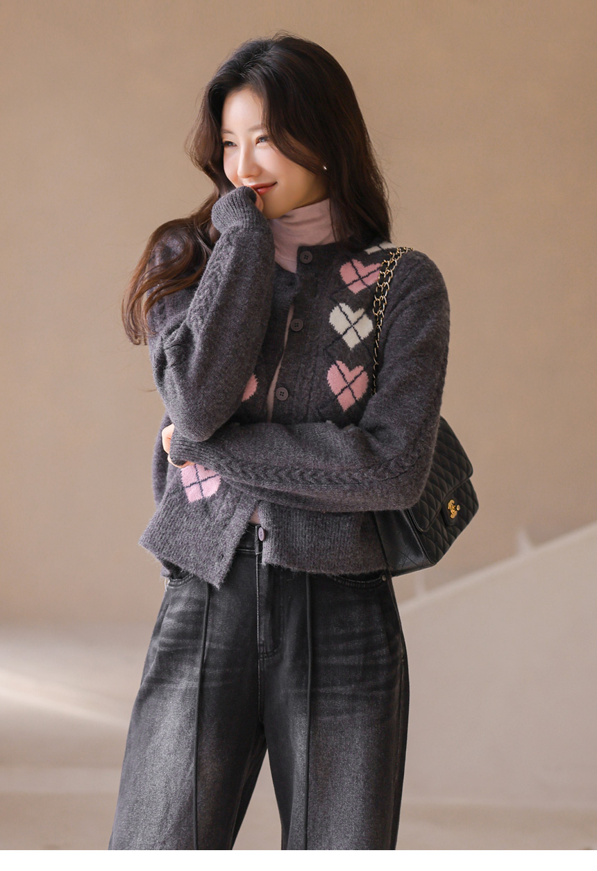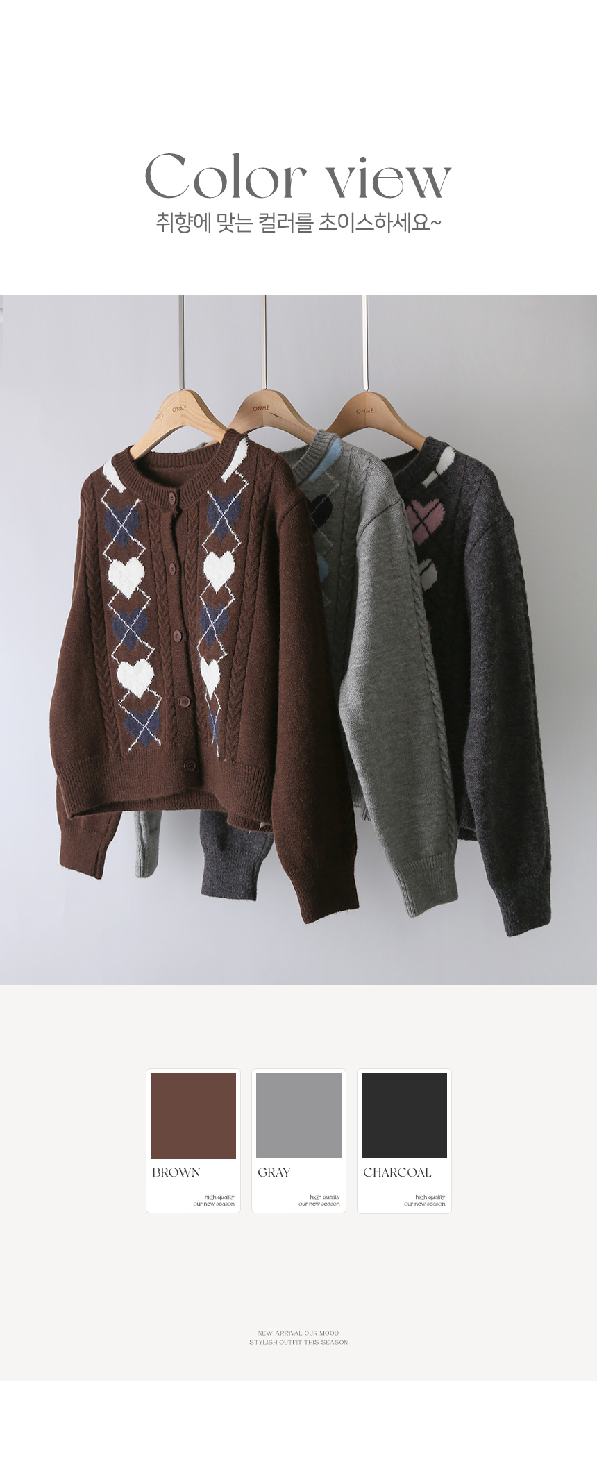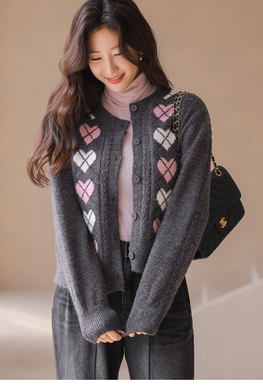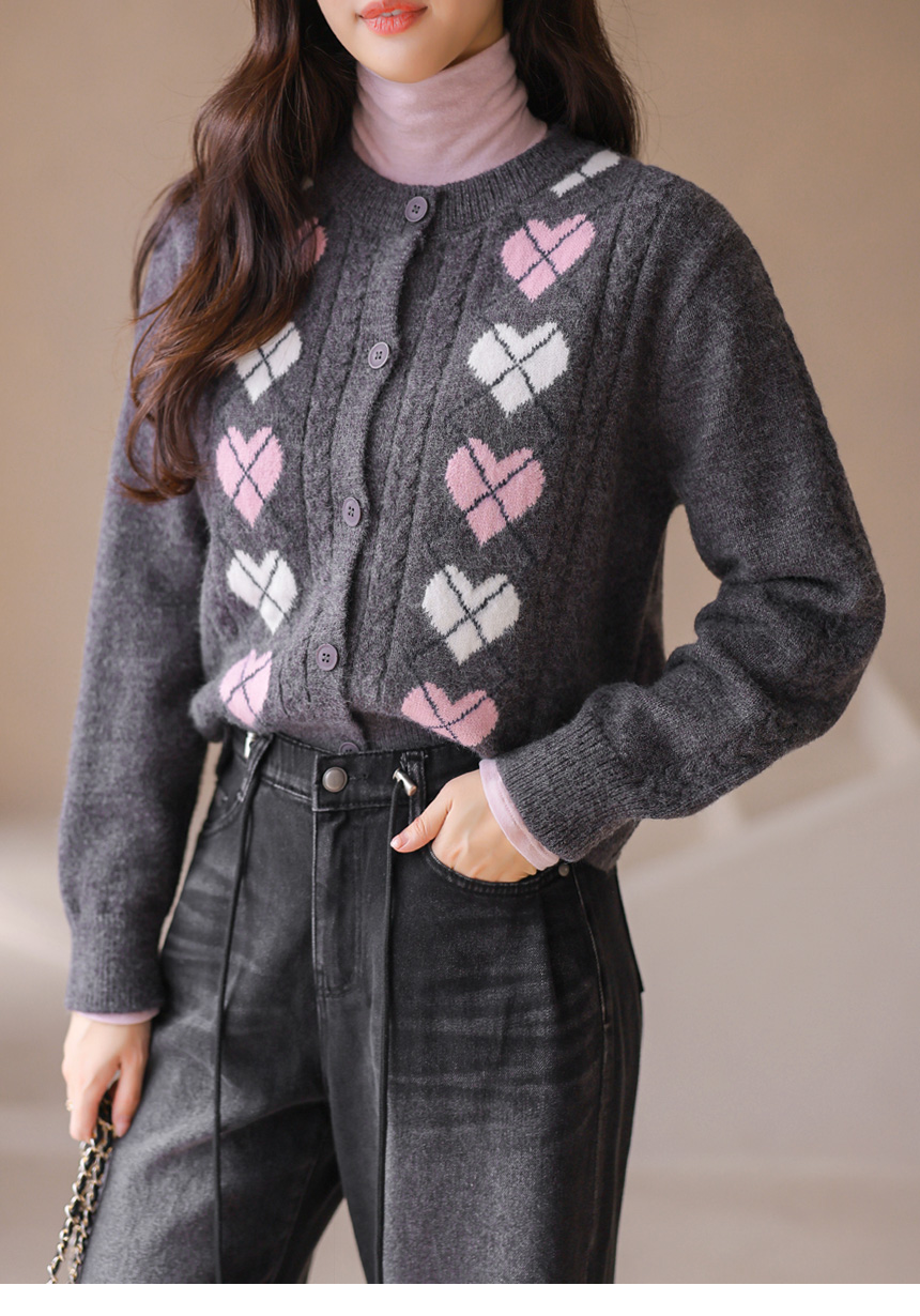 [Charming cardigan blending cable knit detail and heart argyle pattern, perfect for adding warmth and personality to any look.]