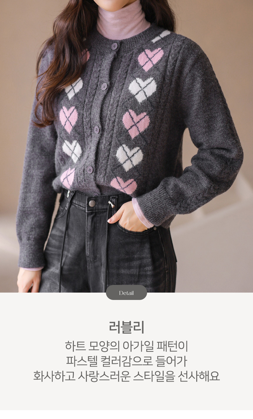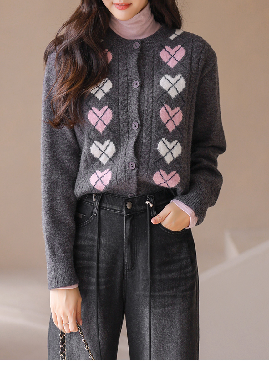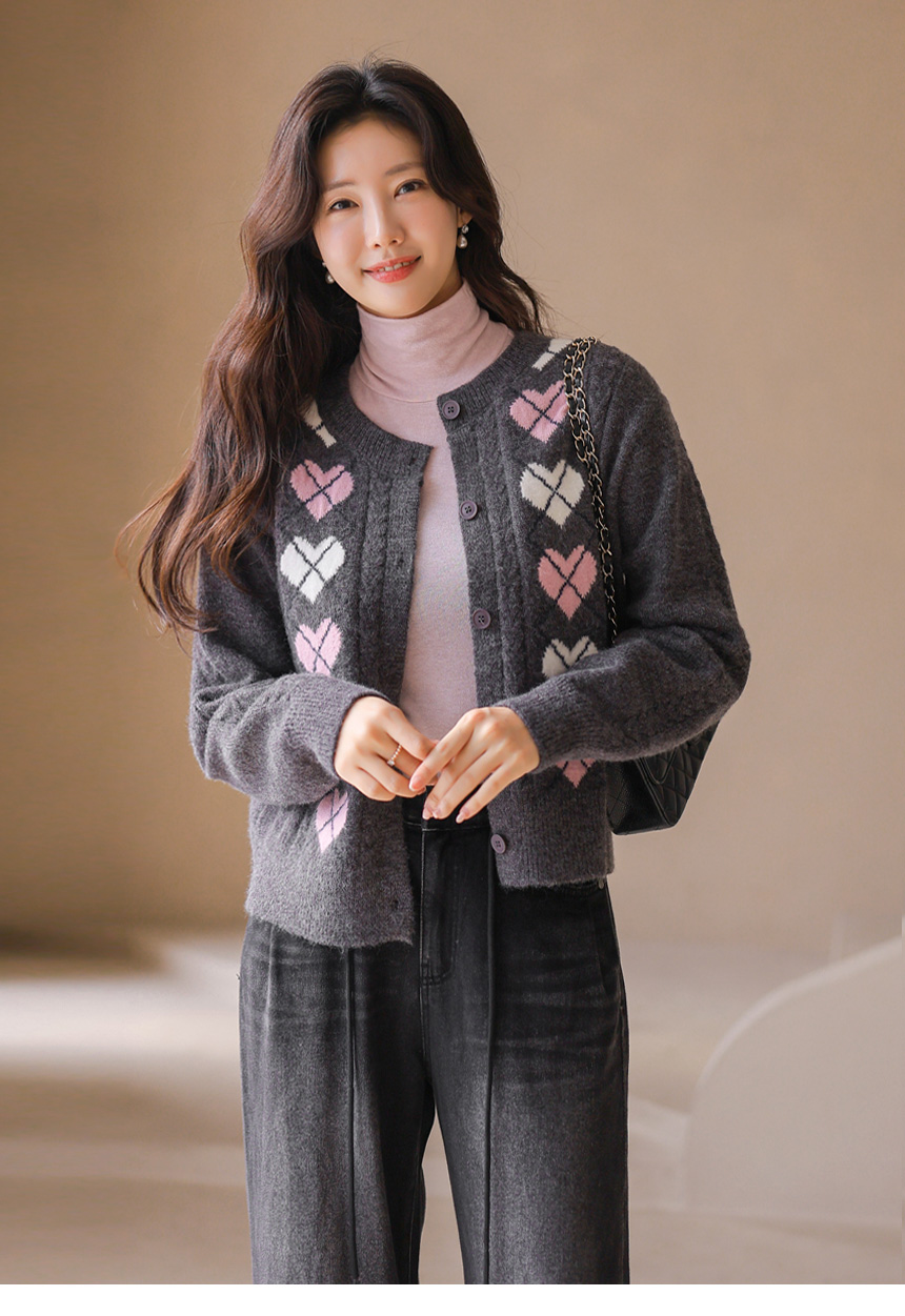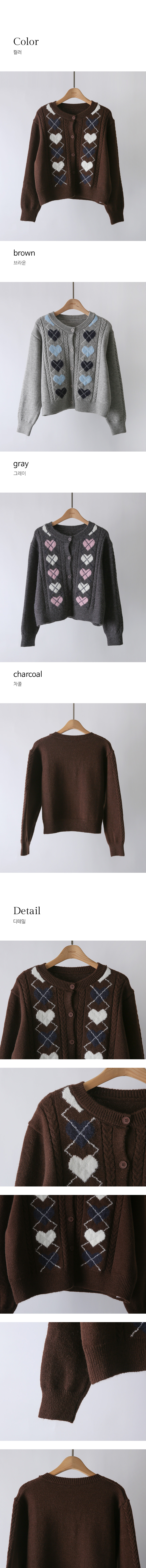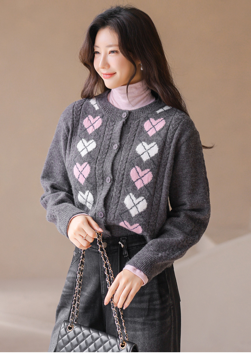 [Charming cardigan blending cable knit detail and heart argyle pattern, perfect for adding warmth and personality to any look.]