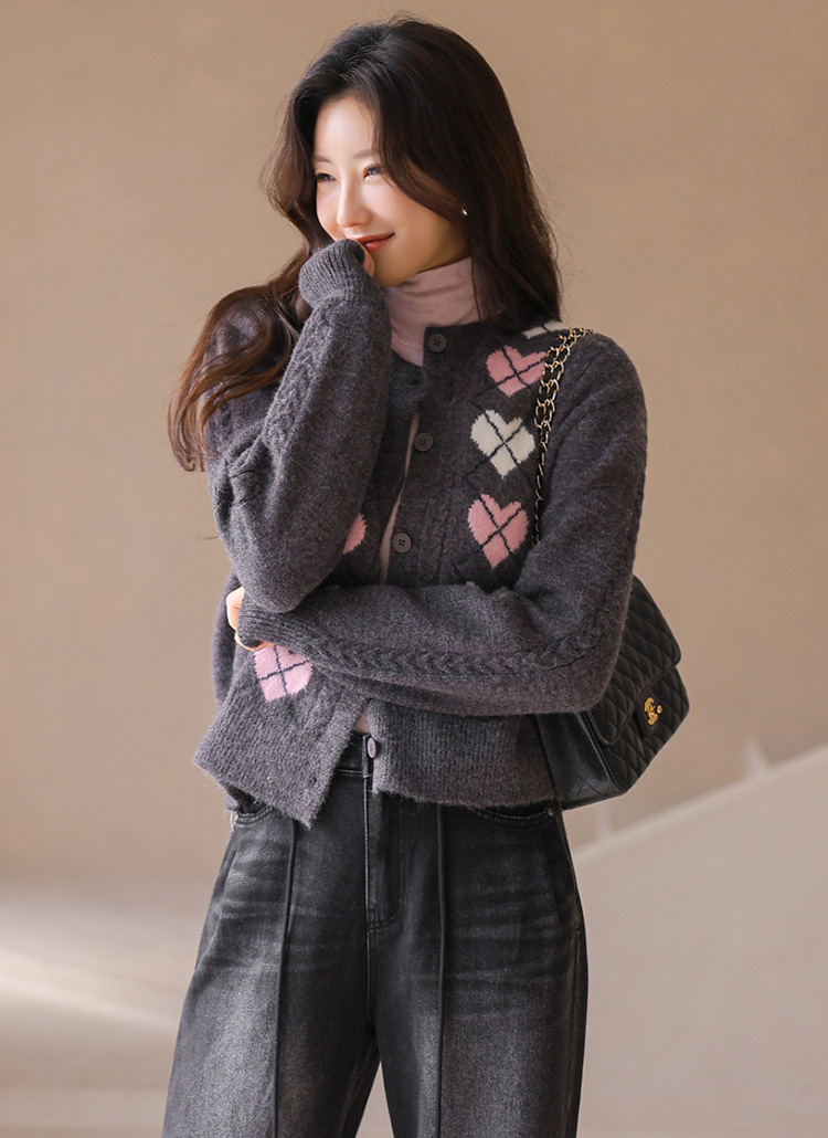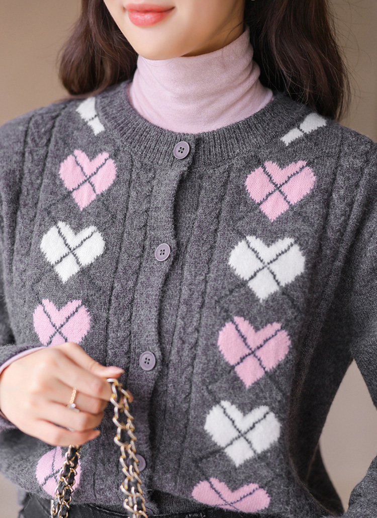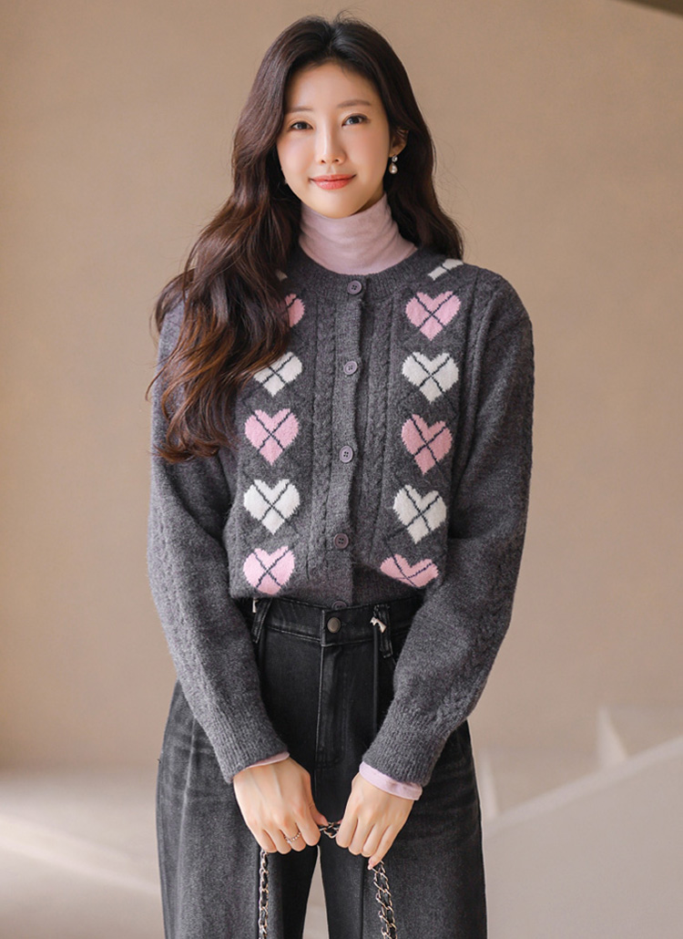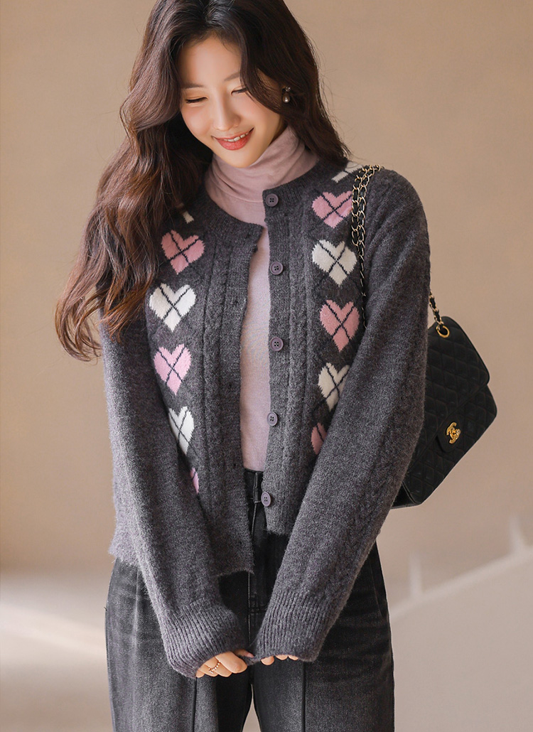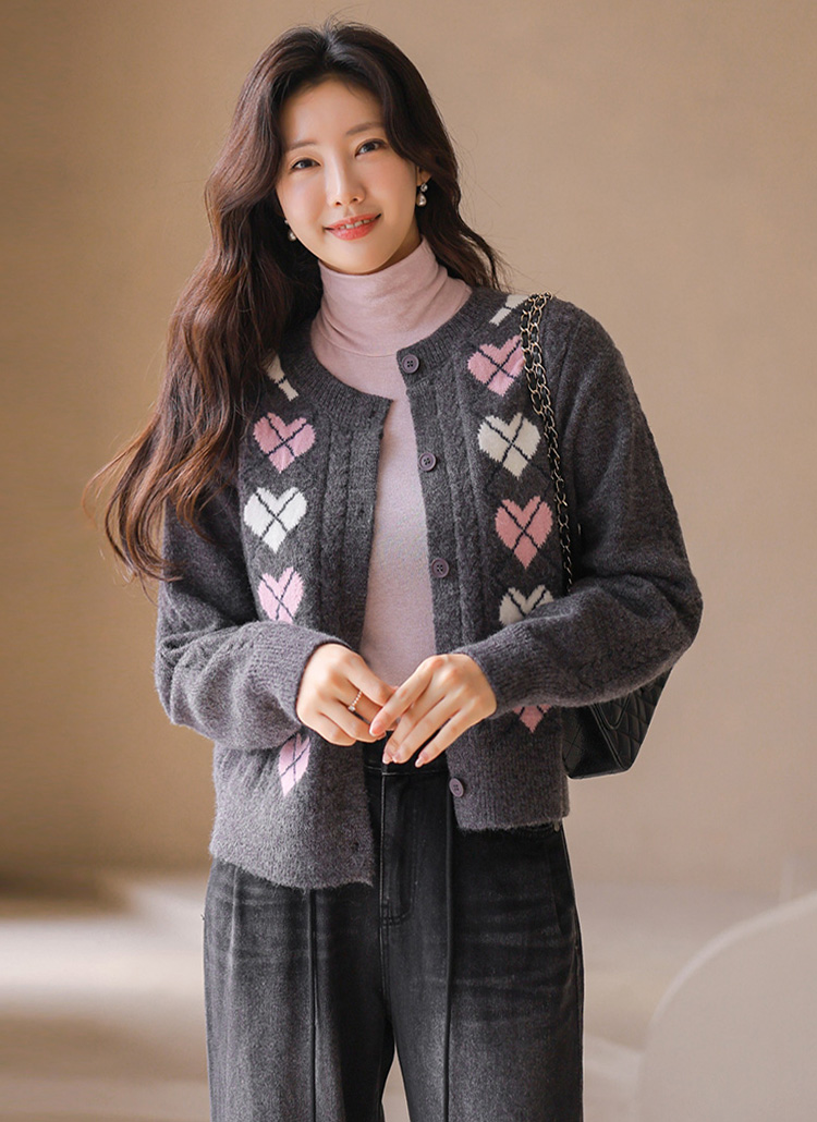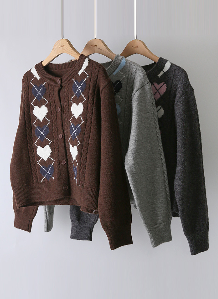 [Charming cardigan blending cable knit detail and heart argyle pattern, perfect for adding warmth and personality to any look.]