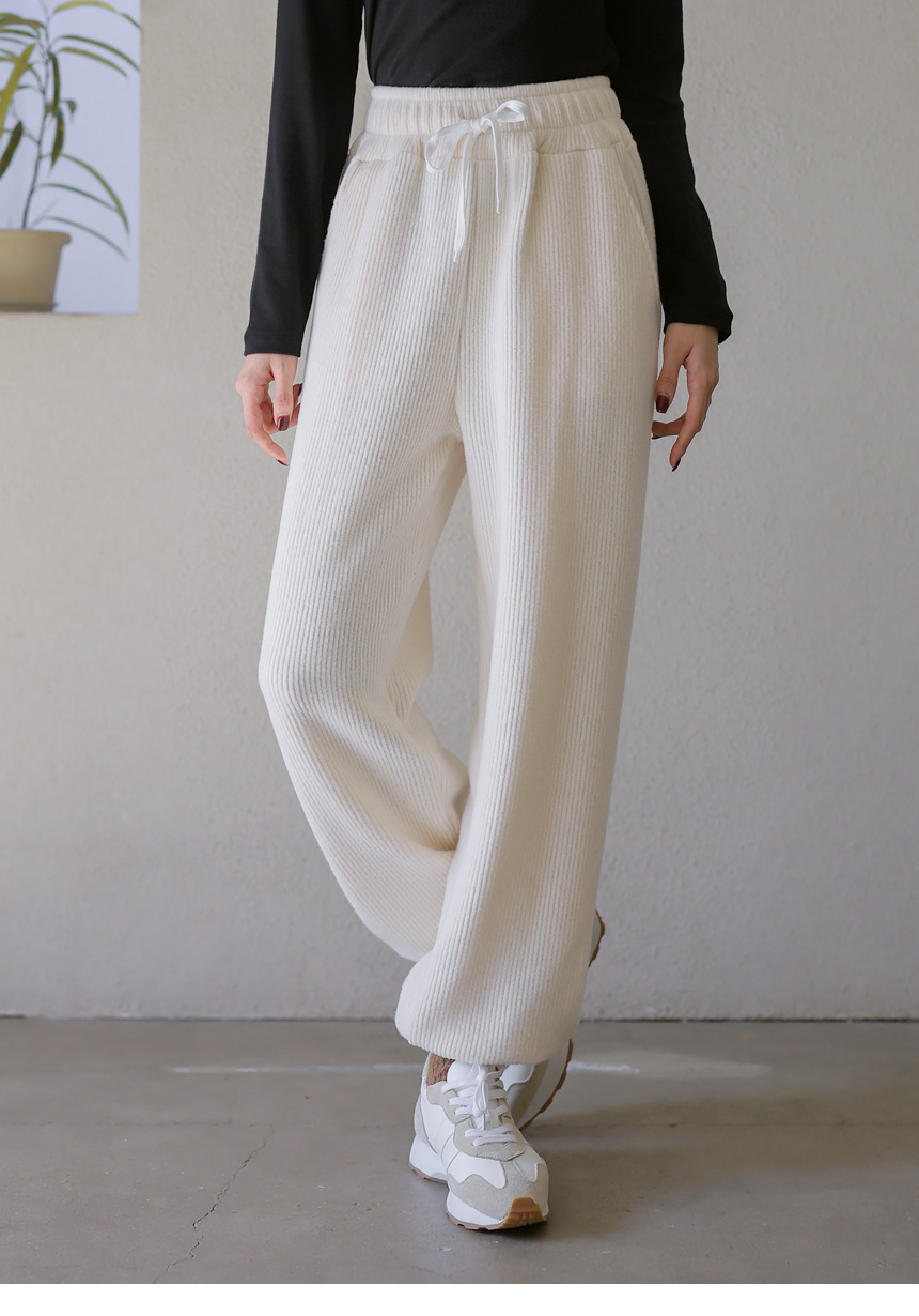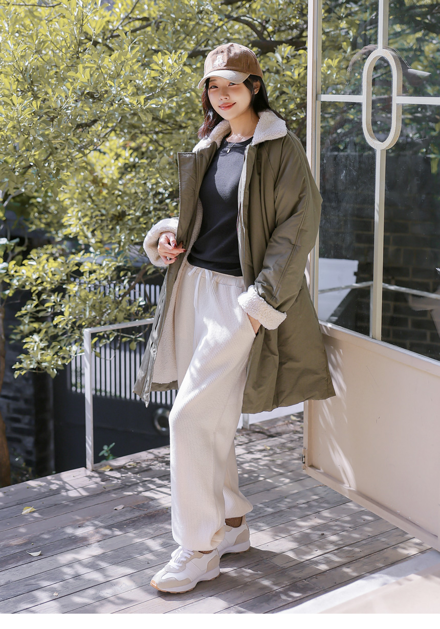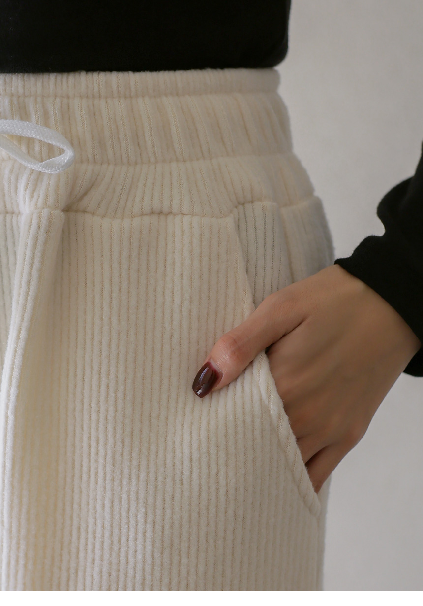 [Warm joggers made from soft peach-fleece corduroy fabric with vertical ribs that elongate the legs and provide a comfy daily fit.]