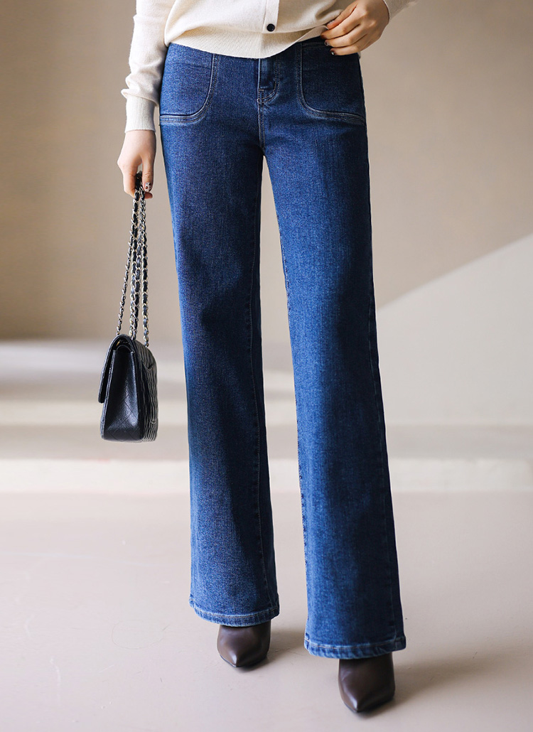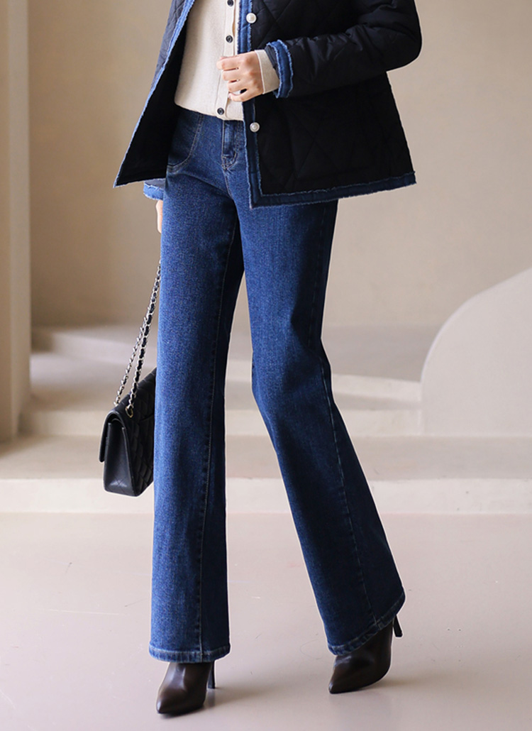 [Soft-lined denim pants with hidden waistband and double-stitch pockets, offering warmth and sleek straight-fit comfort.]