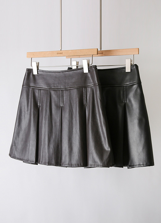[A chic faux leather mini skirt featuring sharp box pleats, a smooth side zipper, and built-in inner shorts for sleek movement and confident all-day wear.]