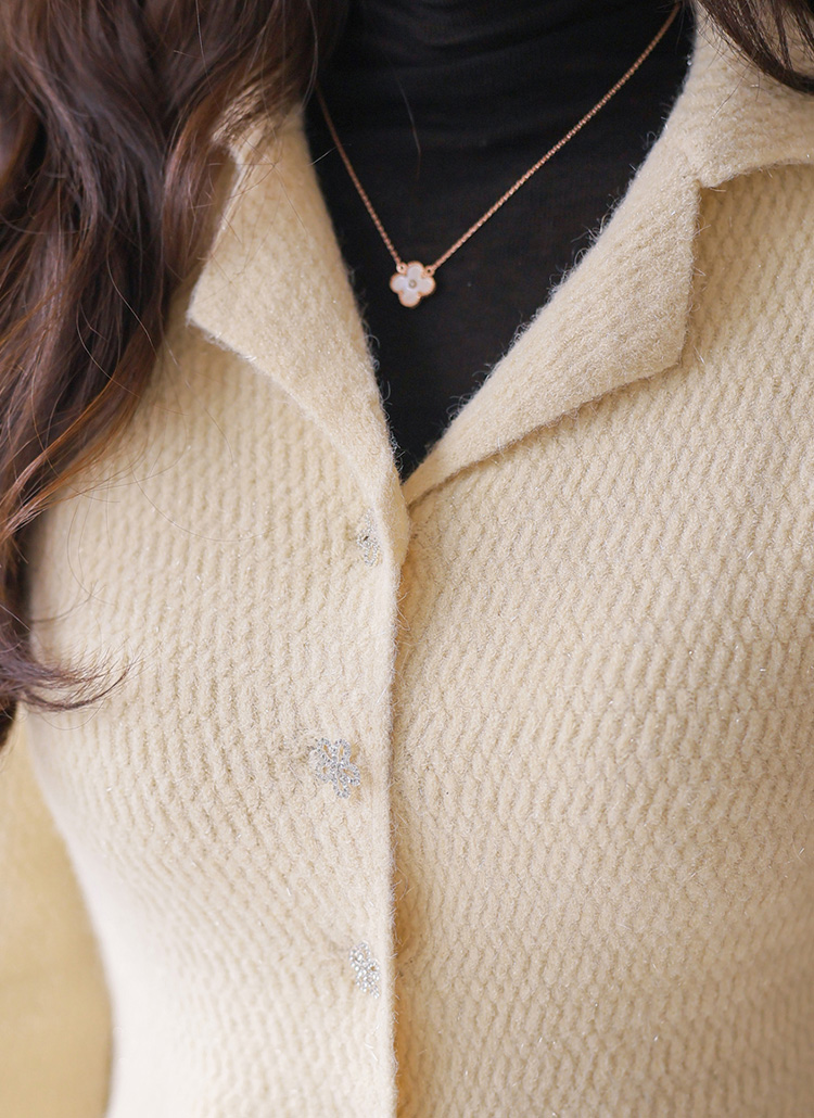 [A cozy jacquard knit cardigan with gentle stretch, finished with a feminine peplum shape and floral jewel buttons that add an elegant, romantic touch.]