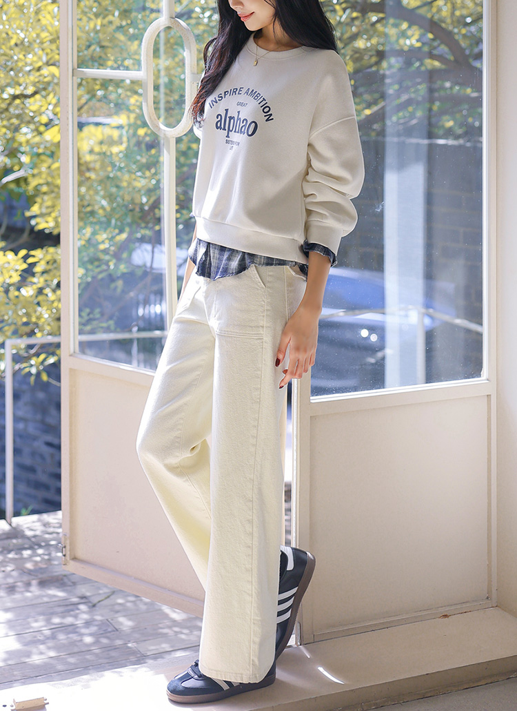 [A clean wide silhouette in soft brushed cotton offers seasonal warmth, enhanced by flap-back pockets and bold front pocket lines that create a sleek, trendy finish.]