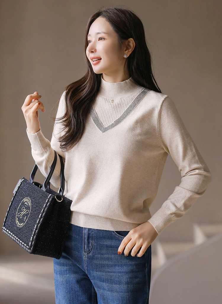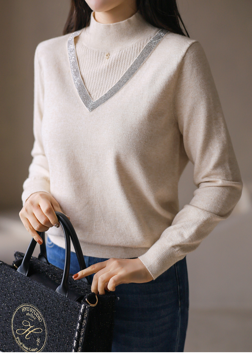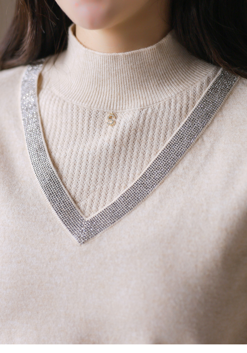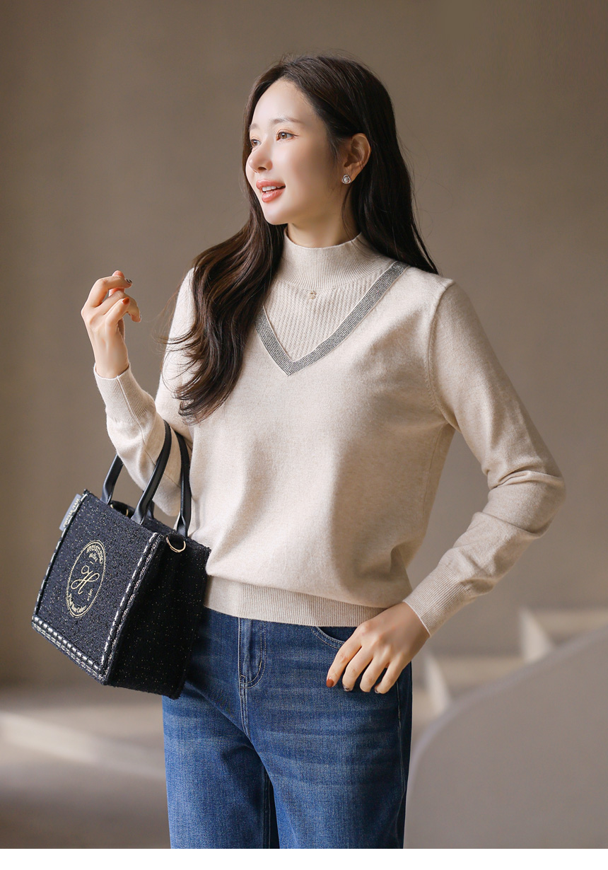 [A soft knit with a sleek mock-neck and shimmering V-trim creates a refined layered look that pairs effortlessly with denim or tailored styles.]