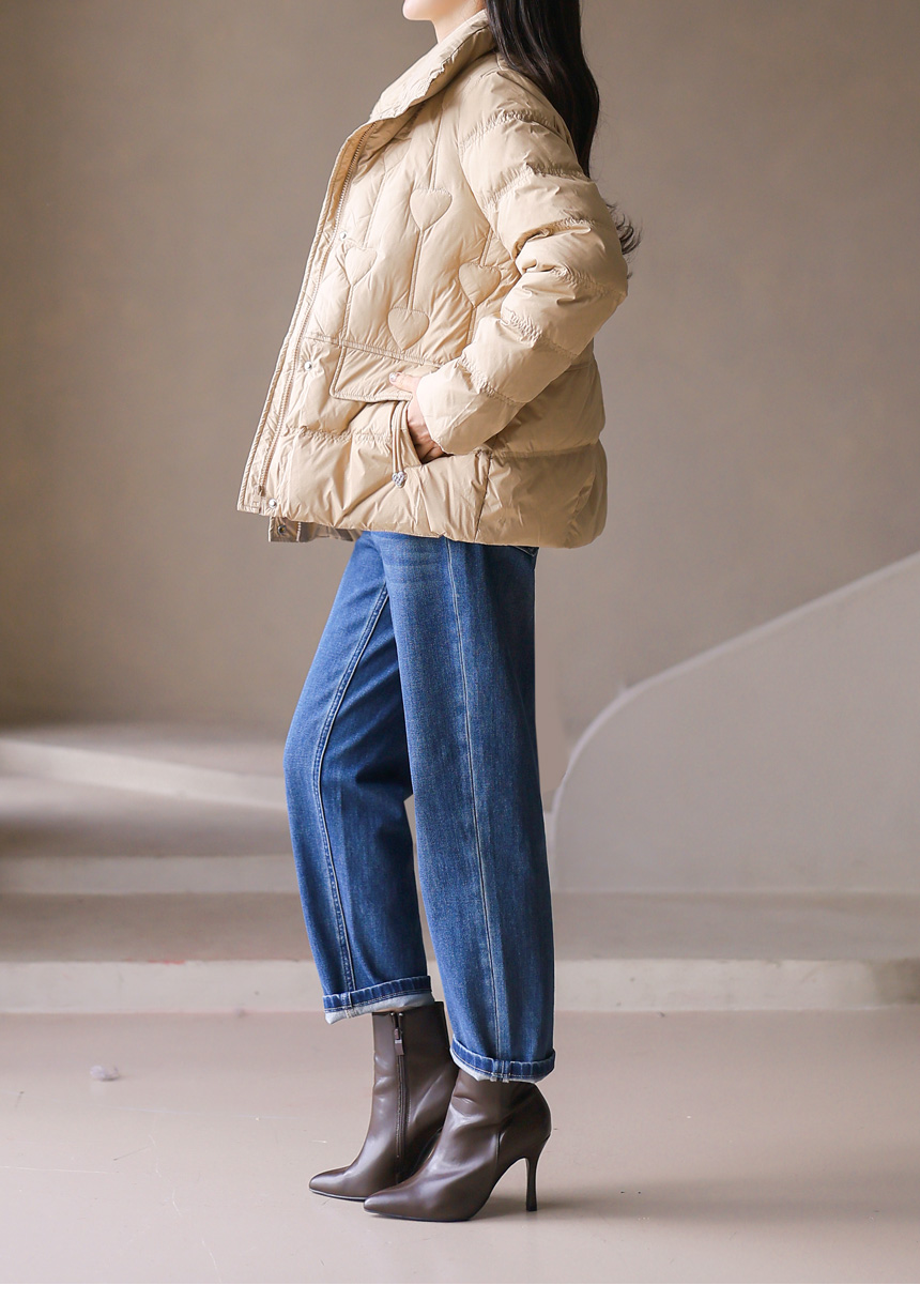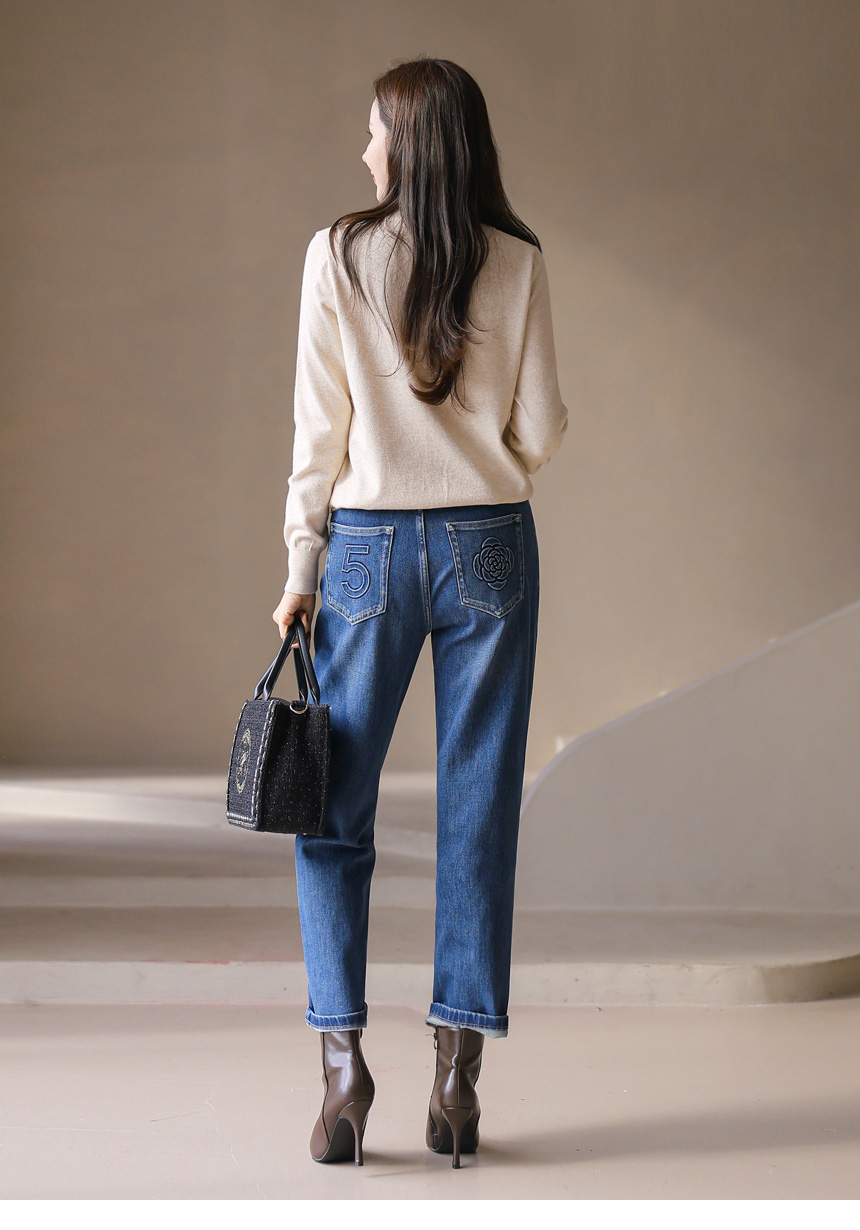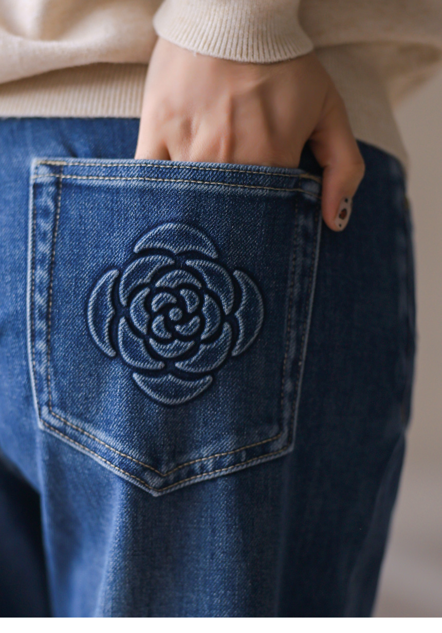 [Softly relaxed with a clean finish, these jeans highlight an embossed flower and number design at the back, giving your style a unique accent.]