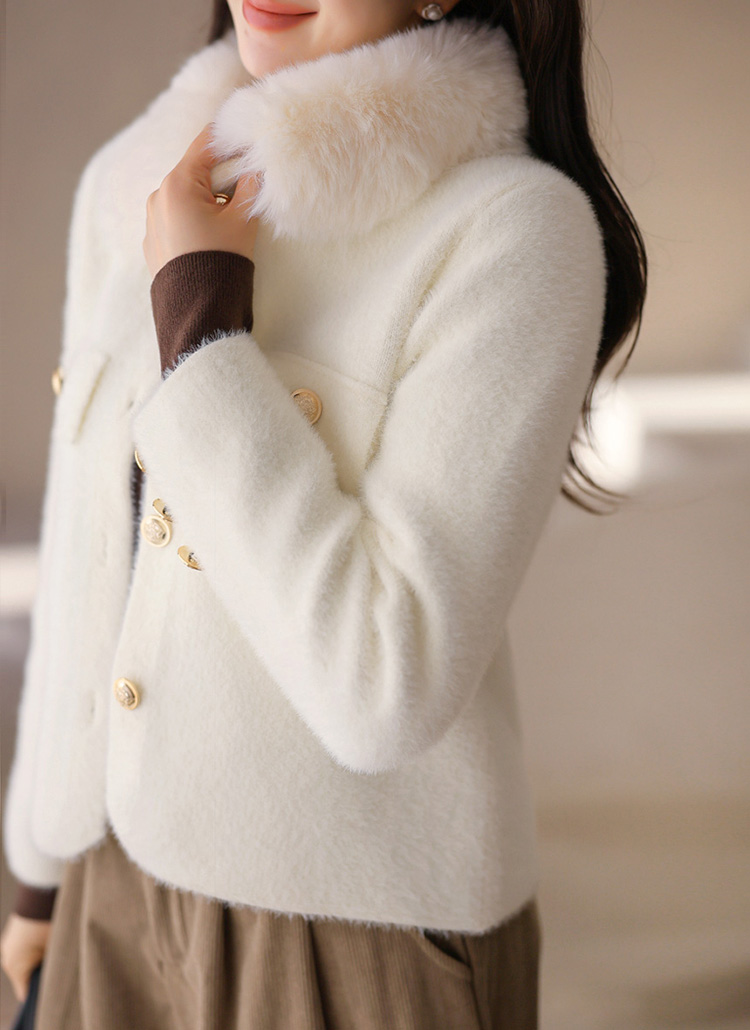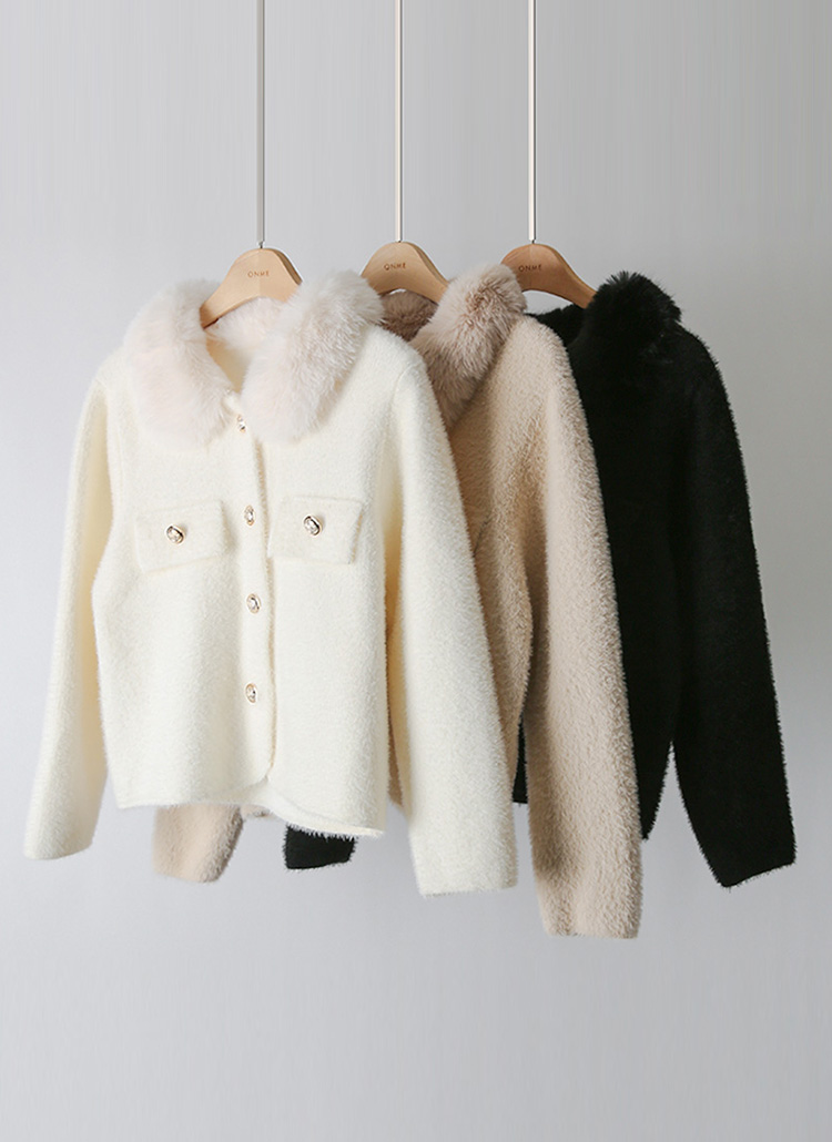 [Light and cozy with luxurious fake fur trim, this fuzzy textured knit cardigan wraps you in gentle warmth and elevates everyday styling with a polished finish.