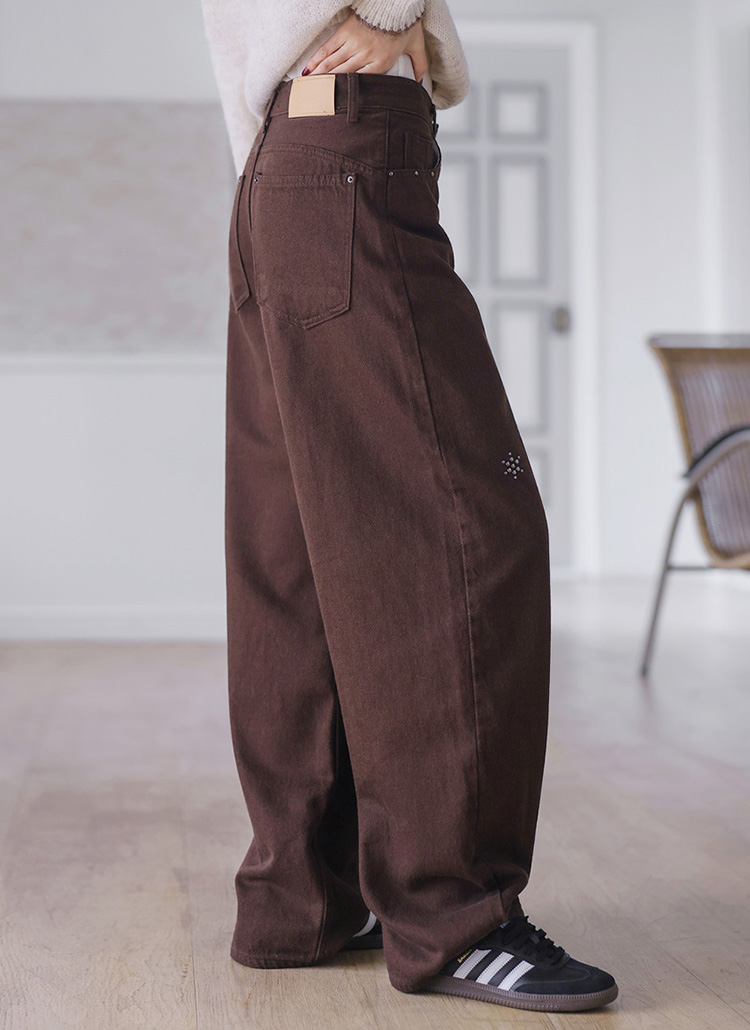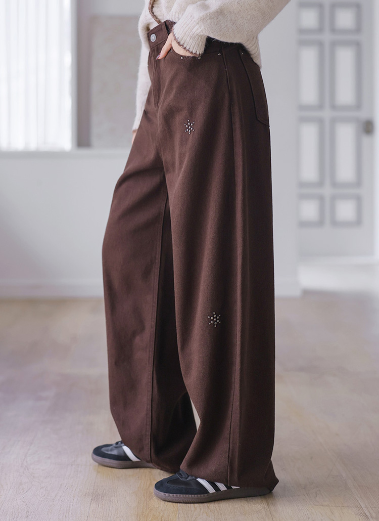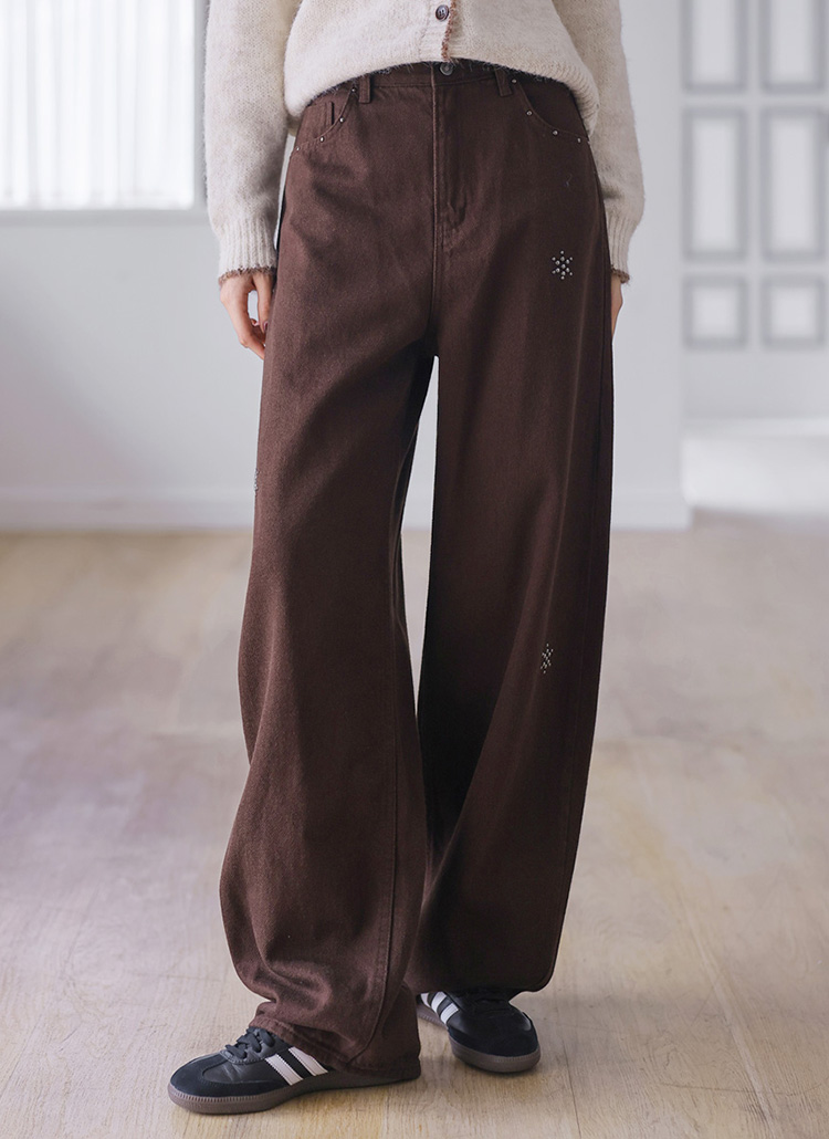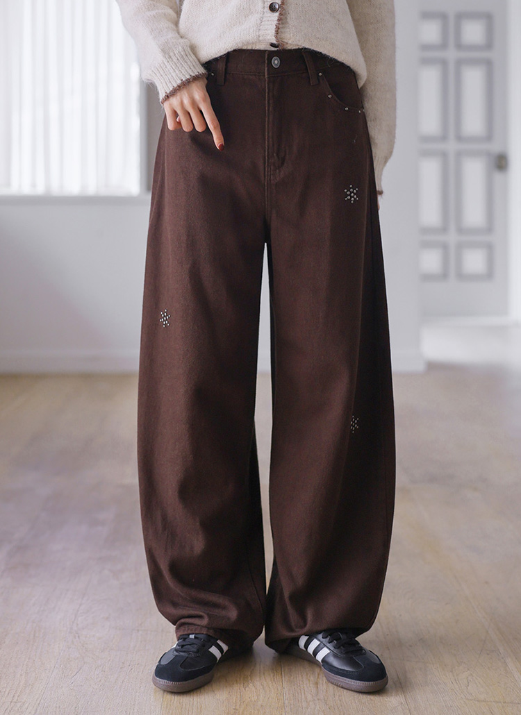[Featuring subtle snowflake-shaped studs and a relaxed wide fit, these cotton pants bring a trendy winter edge to simple tops and casual outfits.]