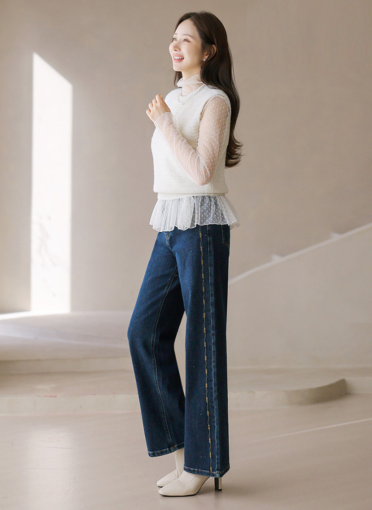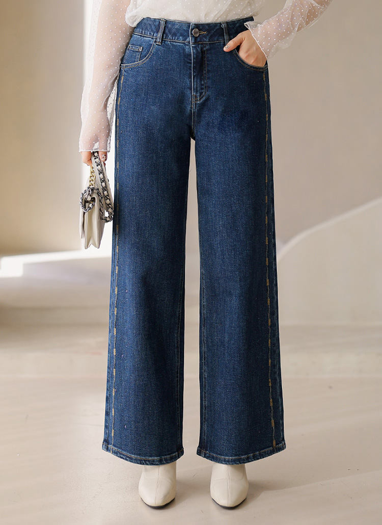 [Soft sparkle accents and a flowing straight-wide fit create a refined look, while hidden waist stretch ensures effortless comfort for everyday wear.]