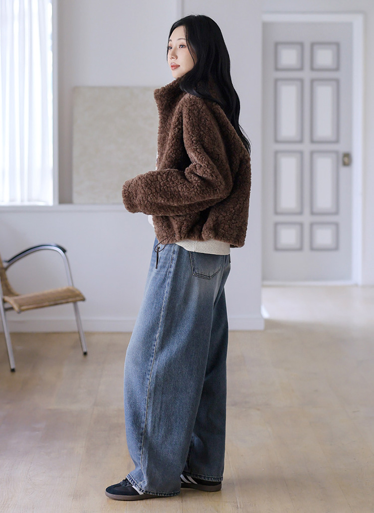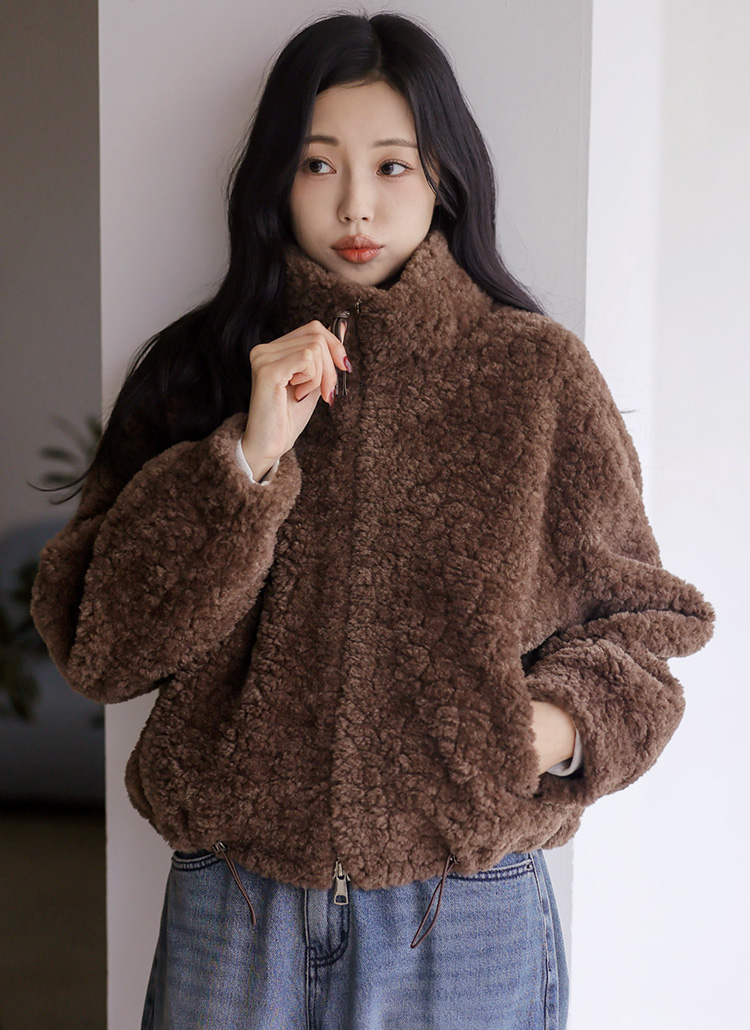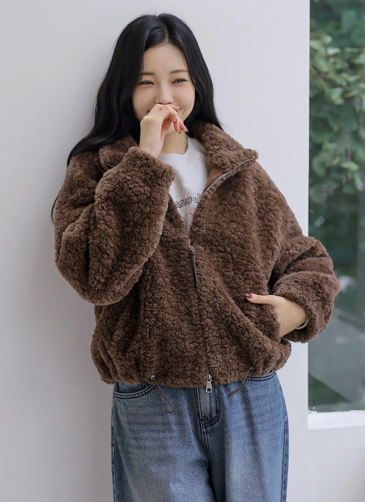 [A soft teddy-texture zip jacket with a warm high-neck, loose silhouette, and adjustable hem that creates a flattering, elongated look for winter days. ]