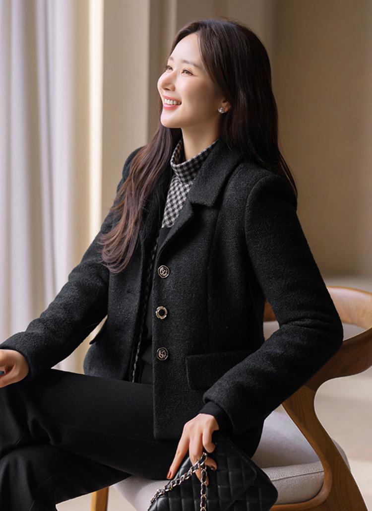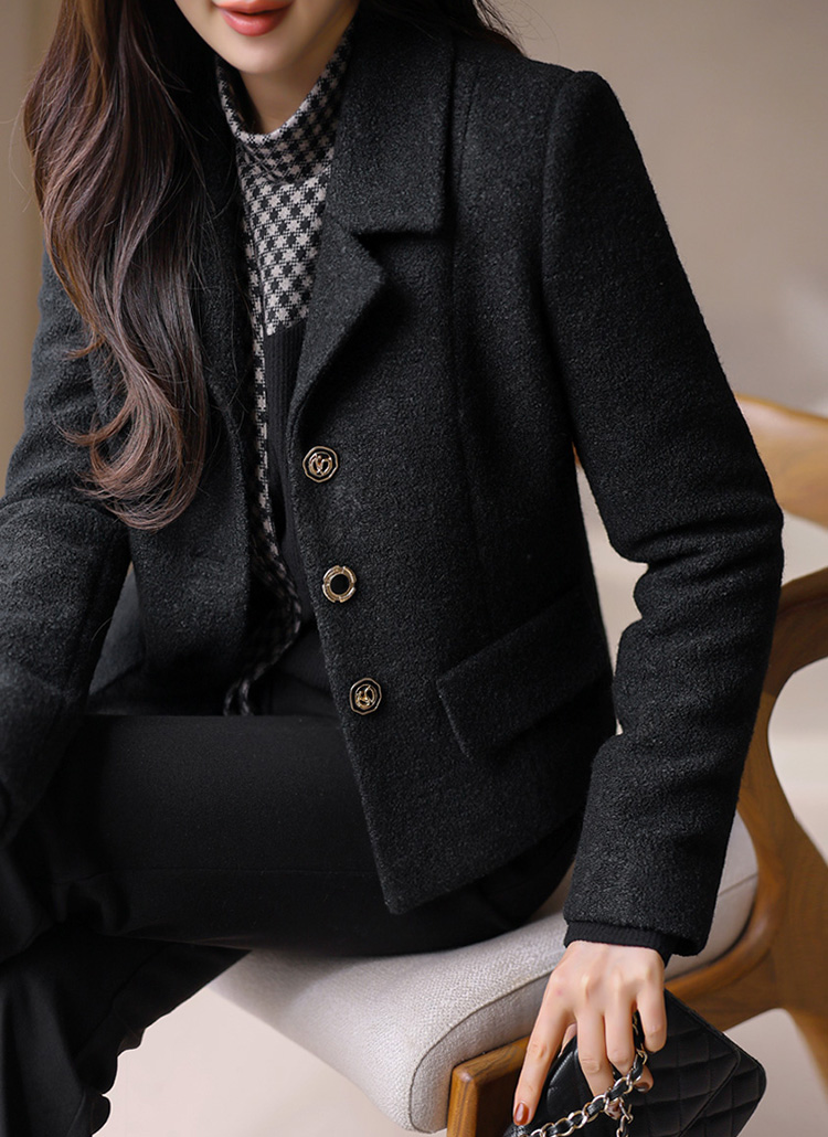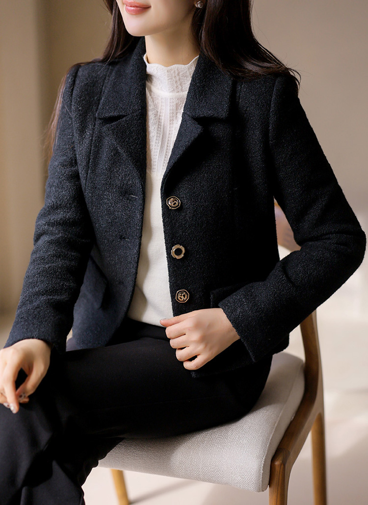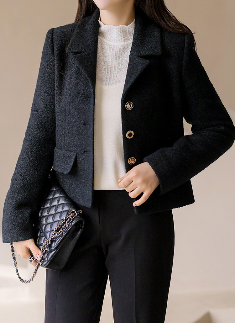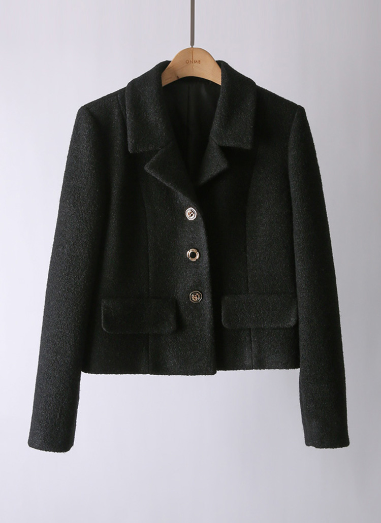 [Soft boucle texture with a warm wool mix creates a refined winter layer, enhanced by unique gold buttons and a sleek, waist-flattering cropped length.]