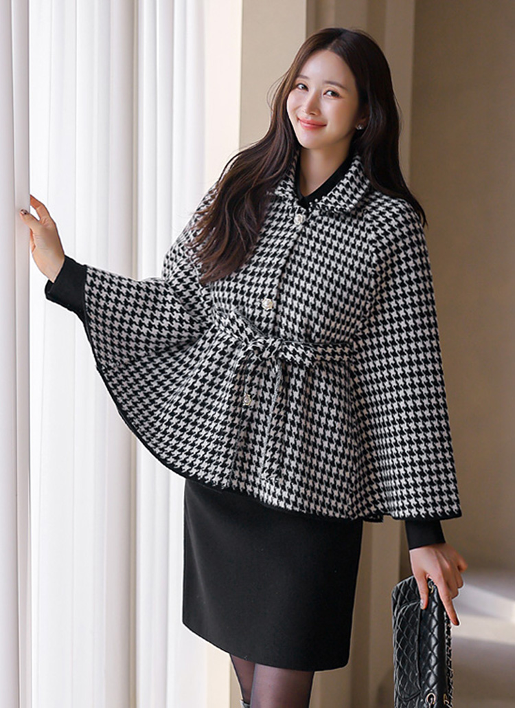[A soft, warm flare cape with bold pearl buttons and a tie belt that shapes the silhouette beautifully, adding refined charm to any winter look.]