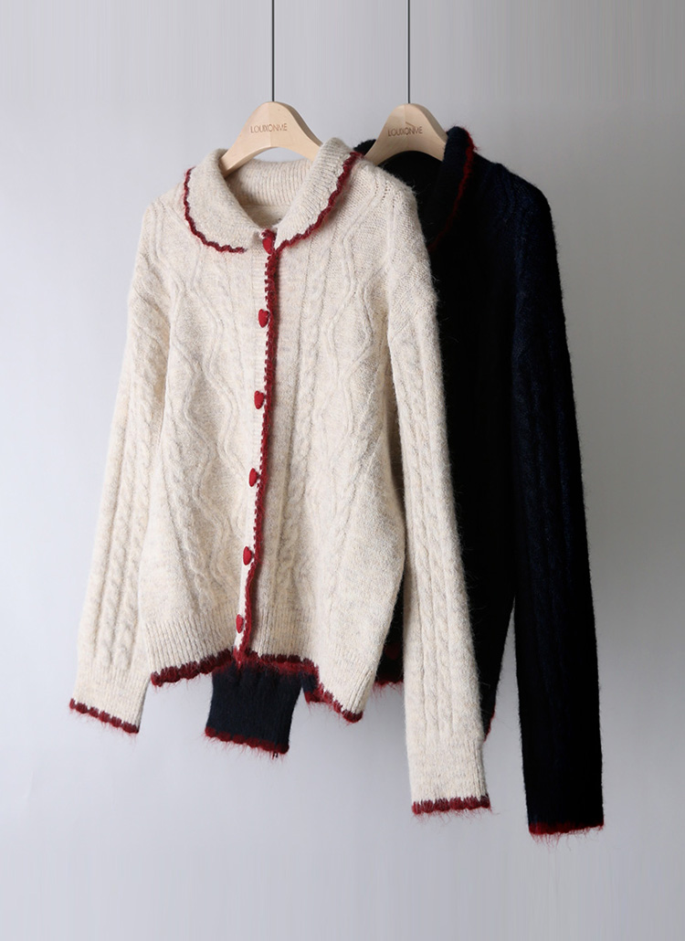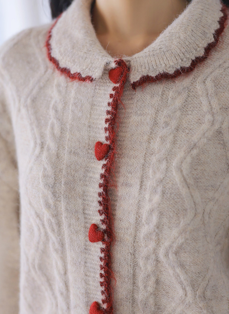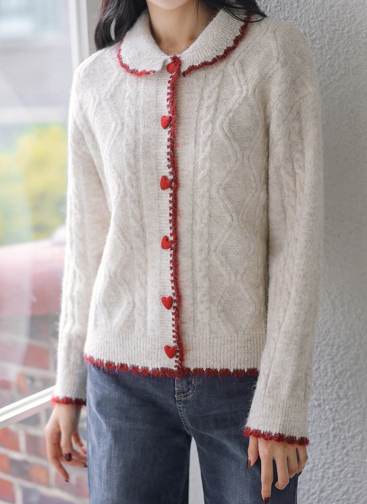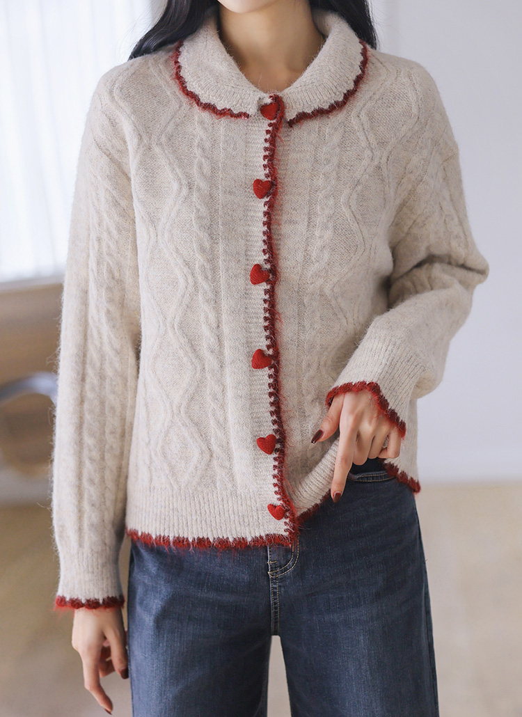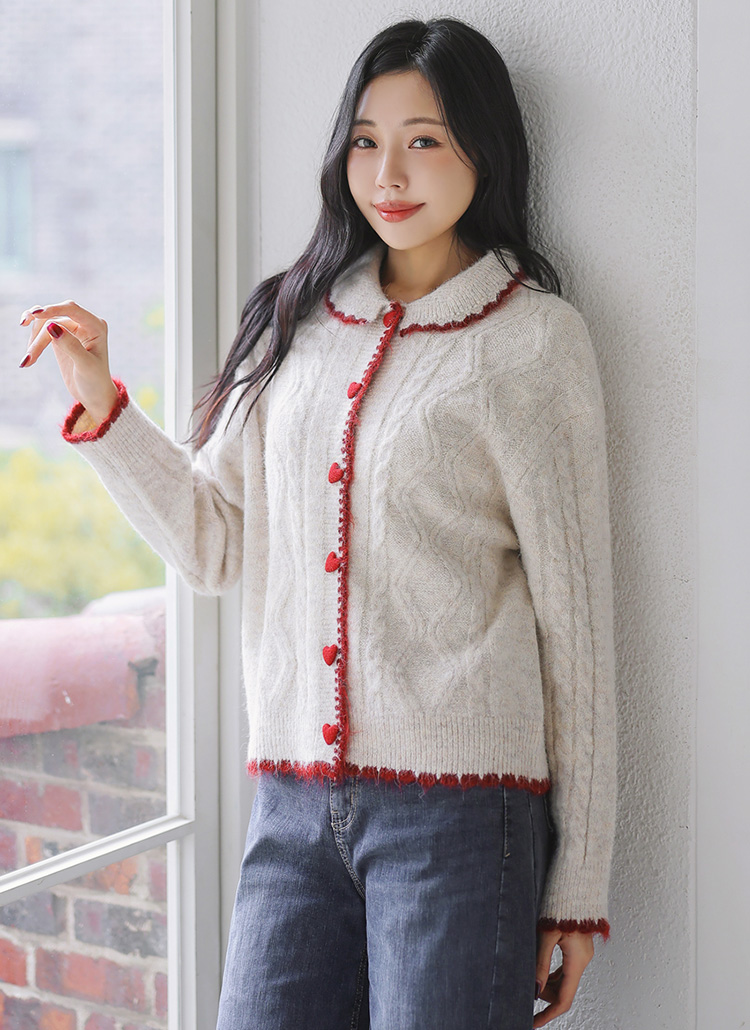 [Romantic accents meet cozy texture in this wool-blend knit, featuring bold edging and playful heart buttons that elevate casual and feminine styling with ease.]