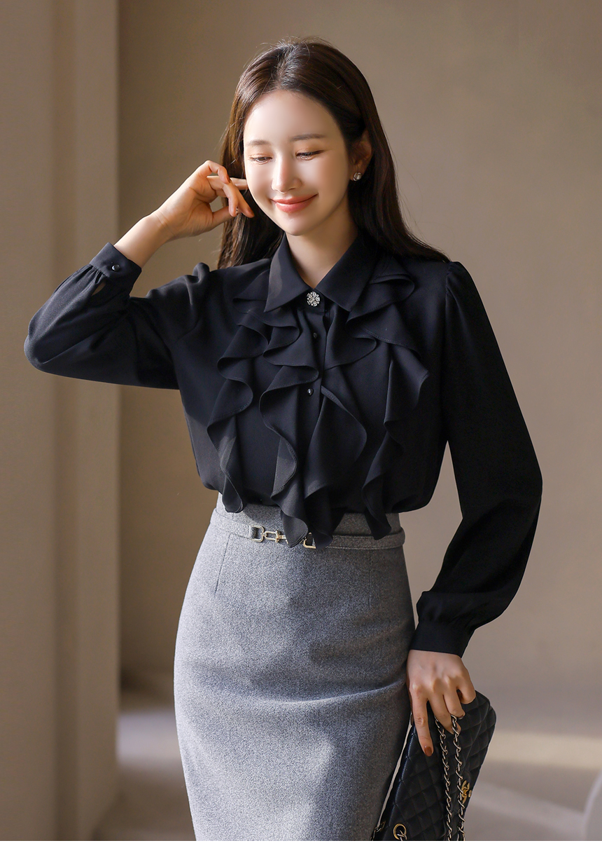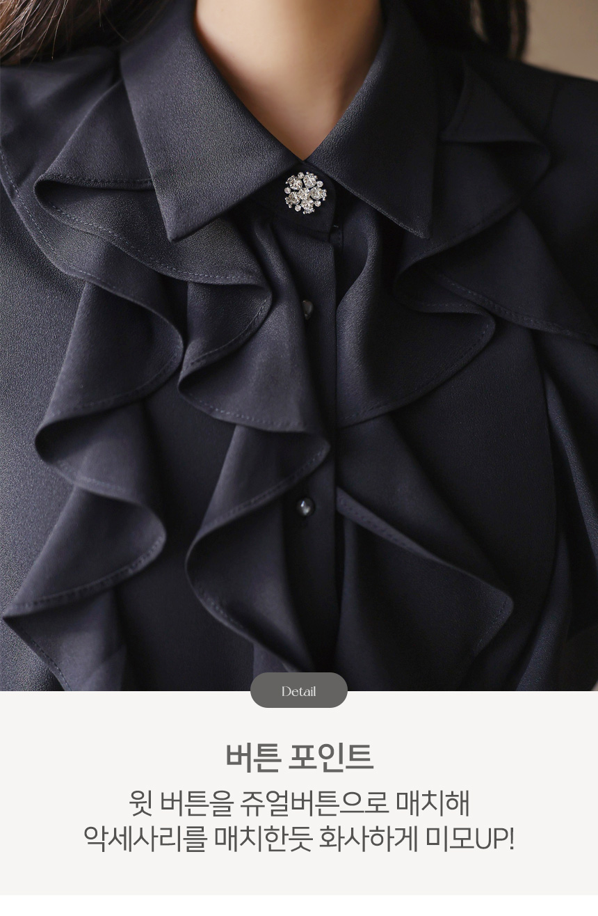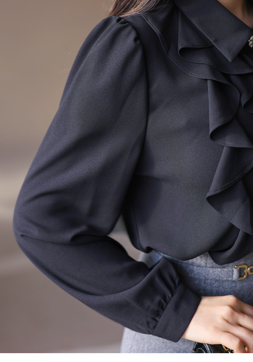 [Soft cascading ruffles create refined volume, while the sparkling top button adds a polished highlight that pairs beautifully with tailored skirts or trousers.]