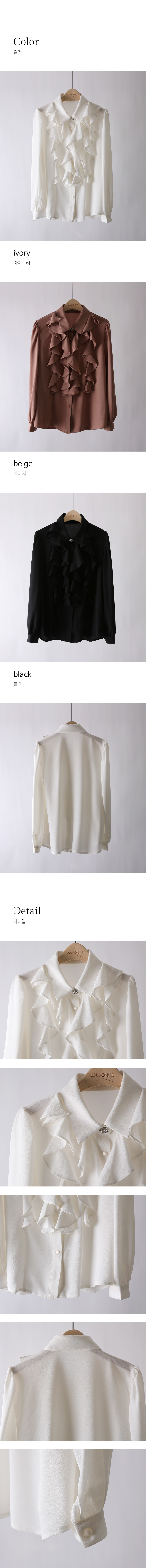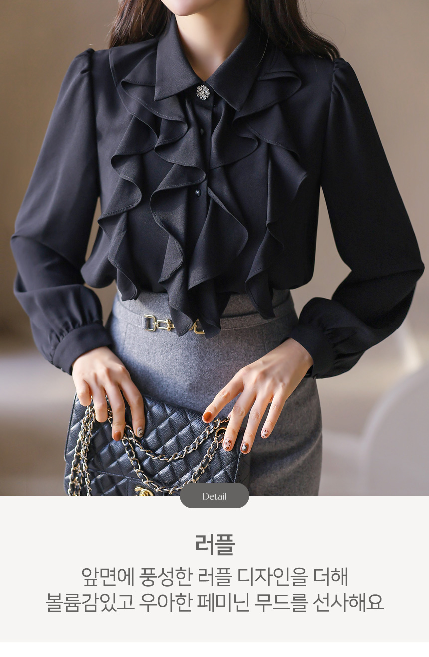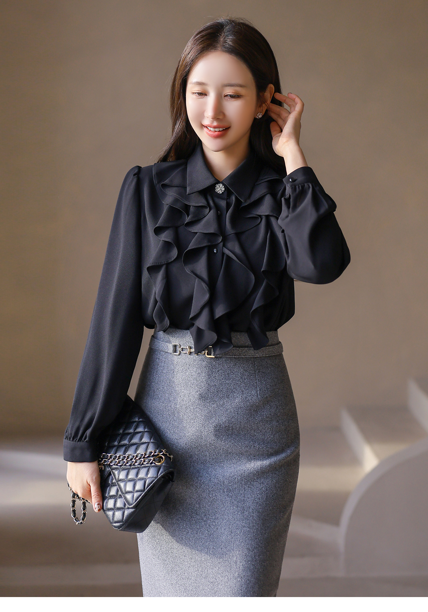 [Soft cascading ruffles create refined volume, while the sparkling top button adds a polished highlight that pairs beautifully with tailored skirts or trousers.]