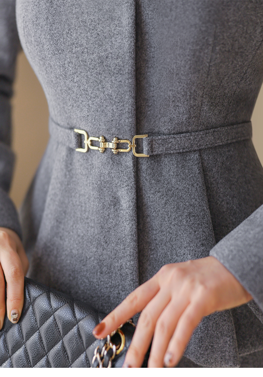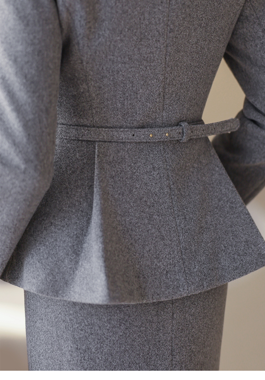 [Structured tailoring meets a graceful peplum flare, finished with a sleek belt that highlights the waist for a sophisticated, feminine winter ensemble.]