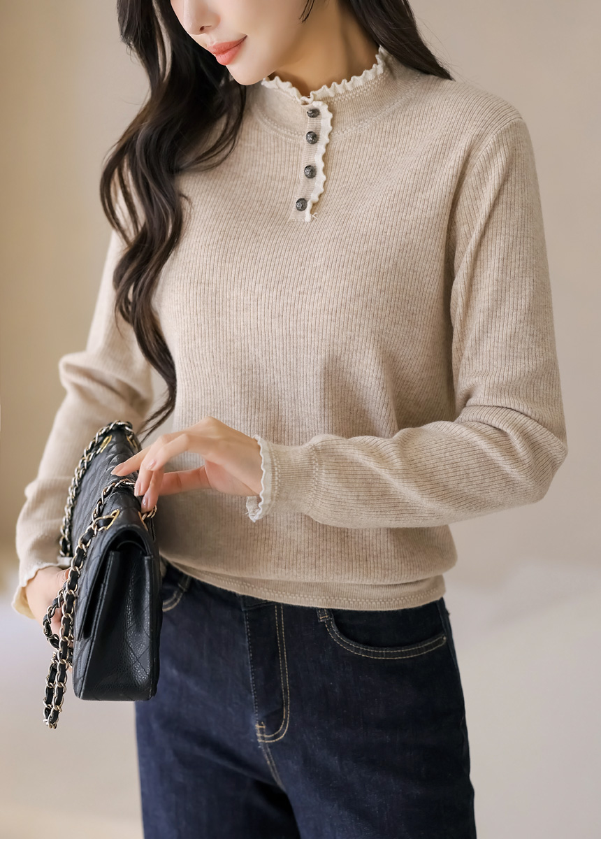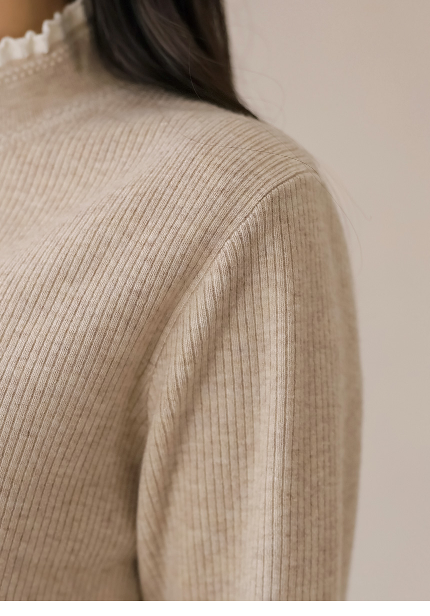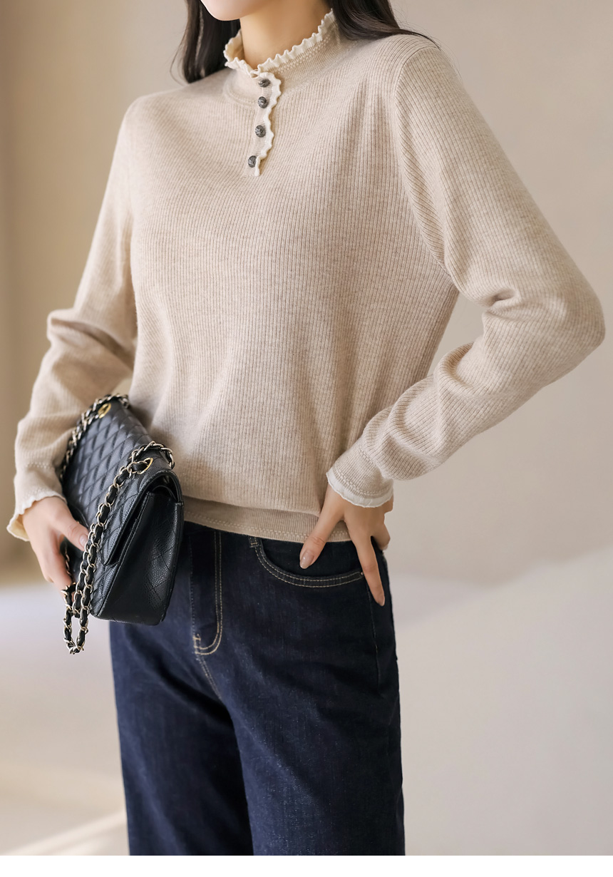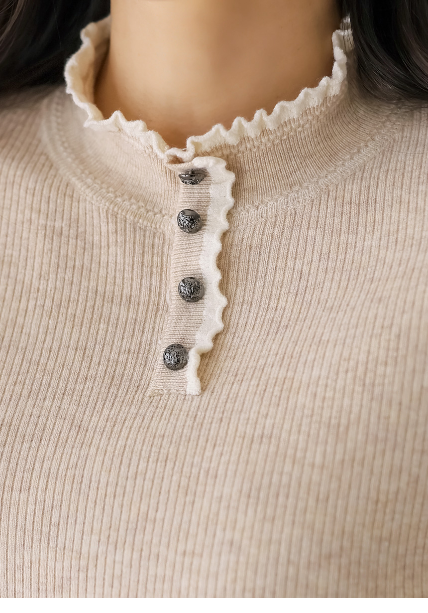 [A cozy ribbed knit with delicate ruffle trim and decorative buttons, offering a sweet polished touch that pairs effortlessly with denim, skirts or layered looks.]