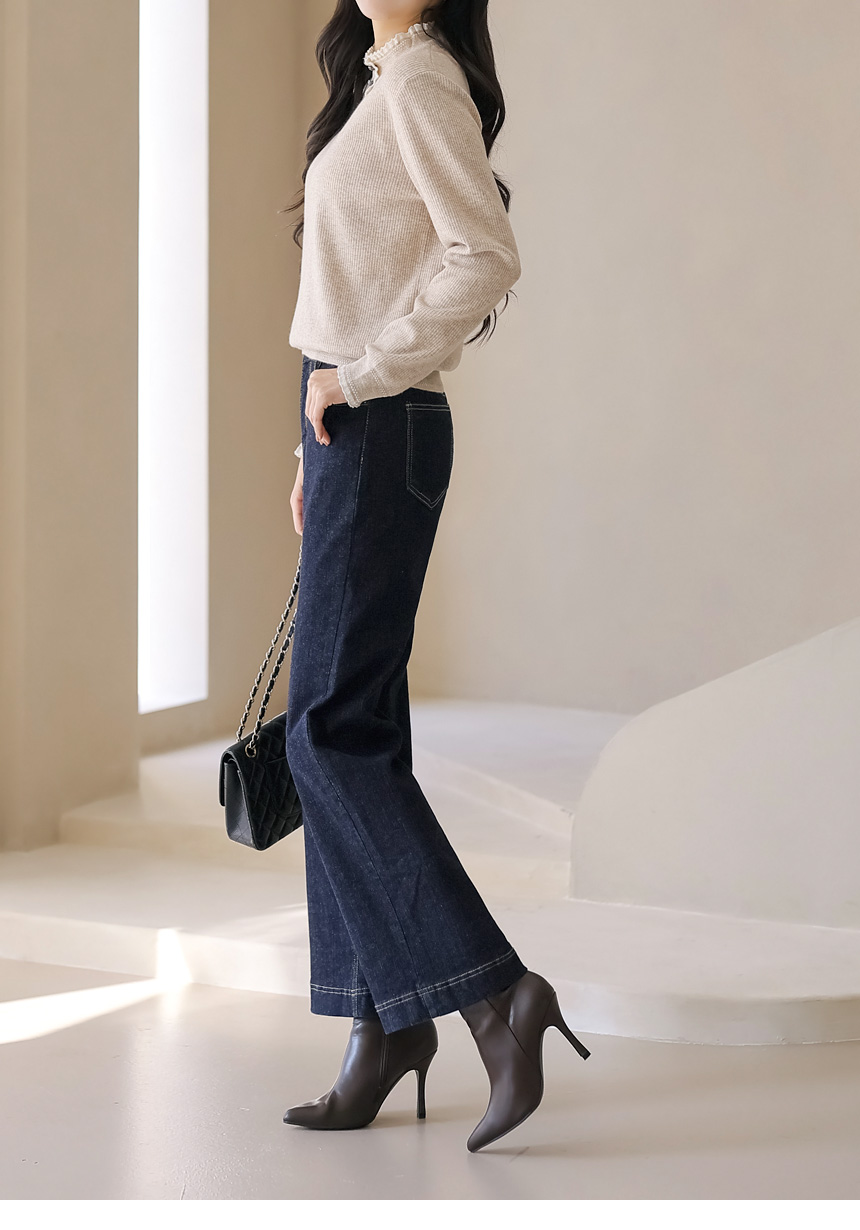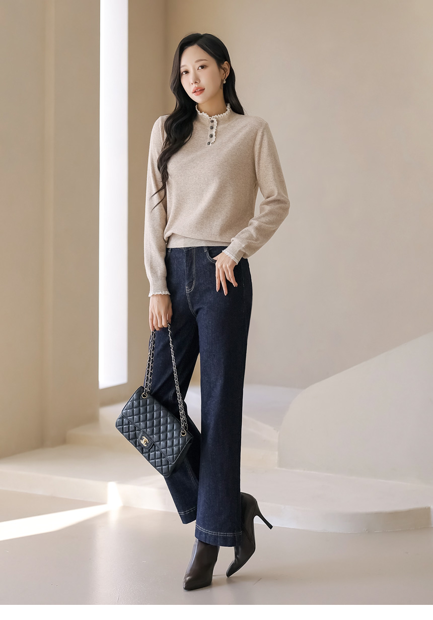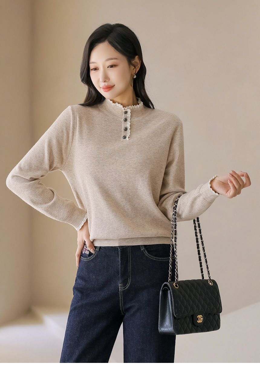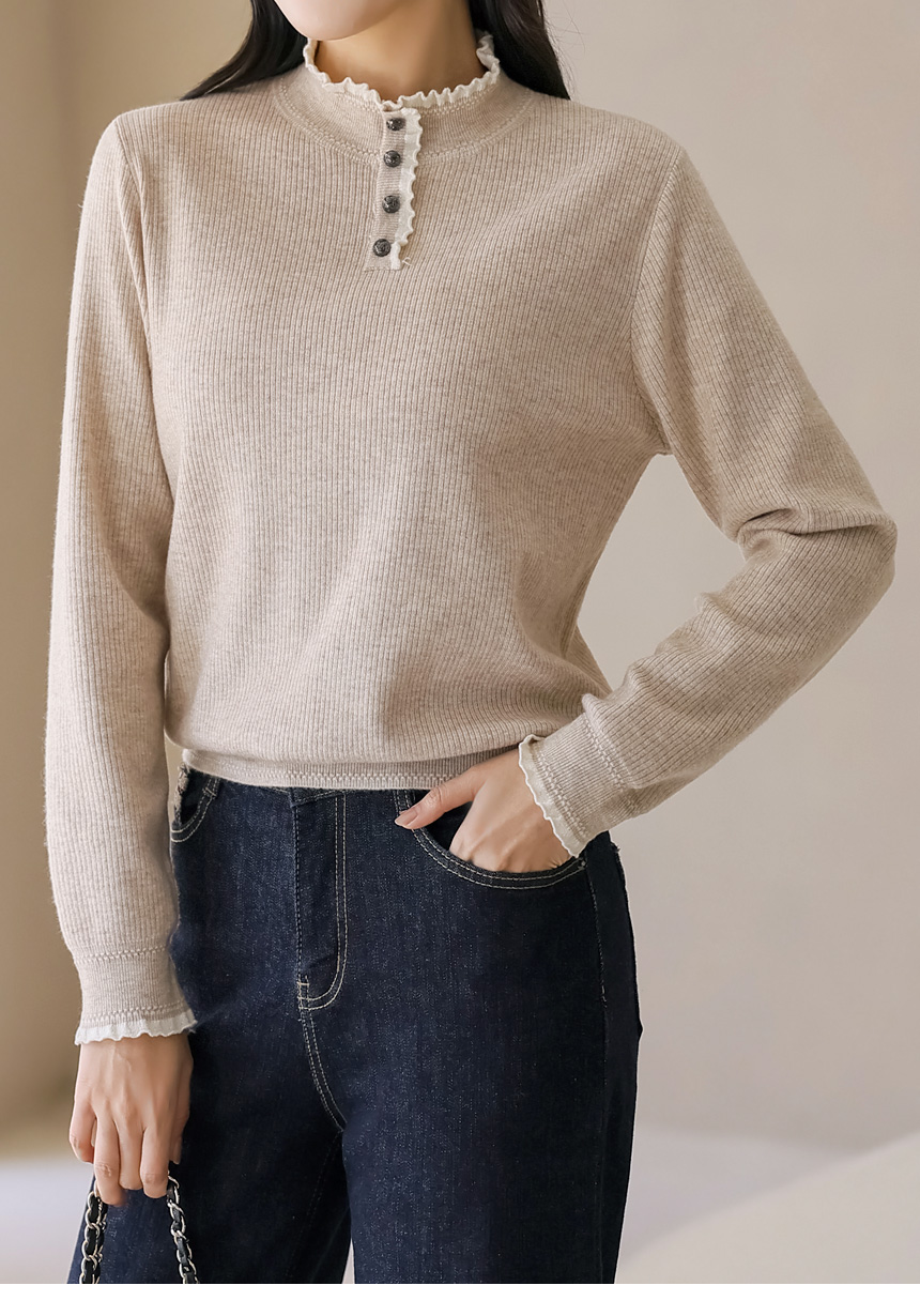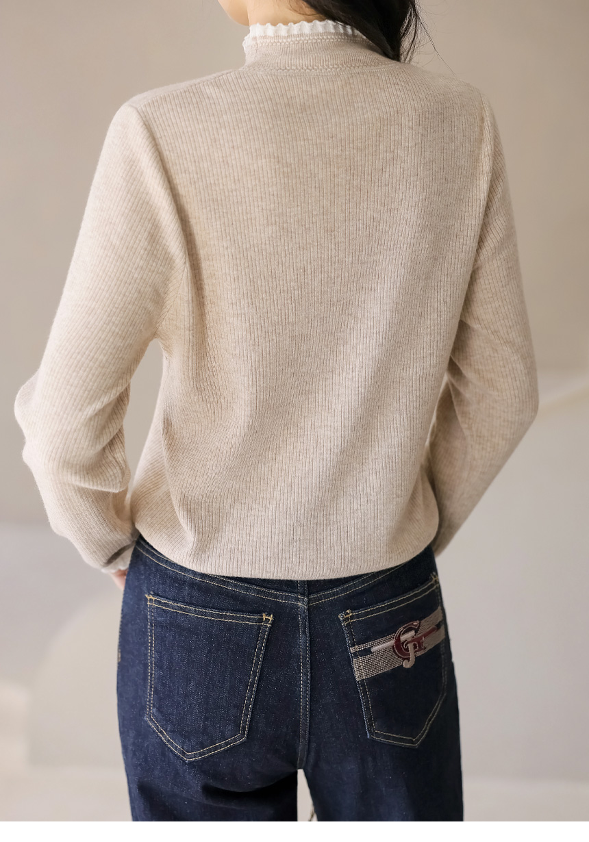 [A cozy ribbed knit with delicate ruffle trim and decorative buttons, offering a sweet polished touch that pairs effortlessly with denim, skirts or layered looks.]