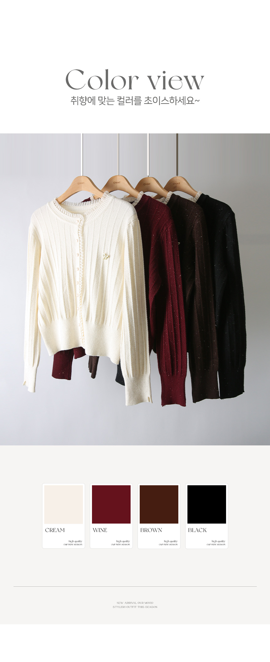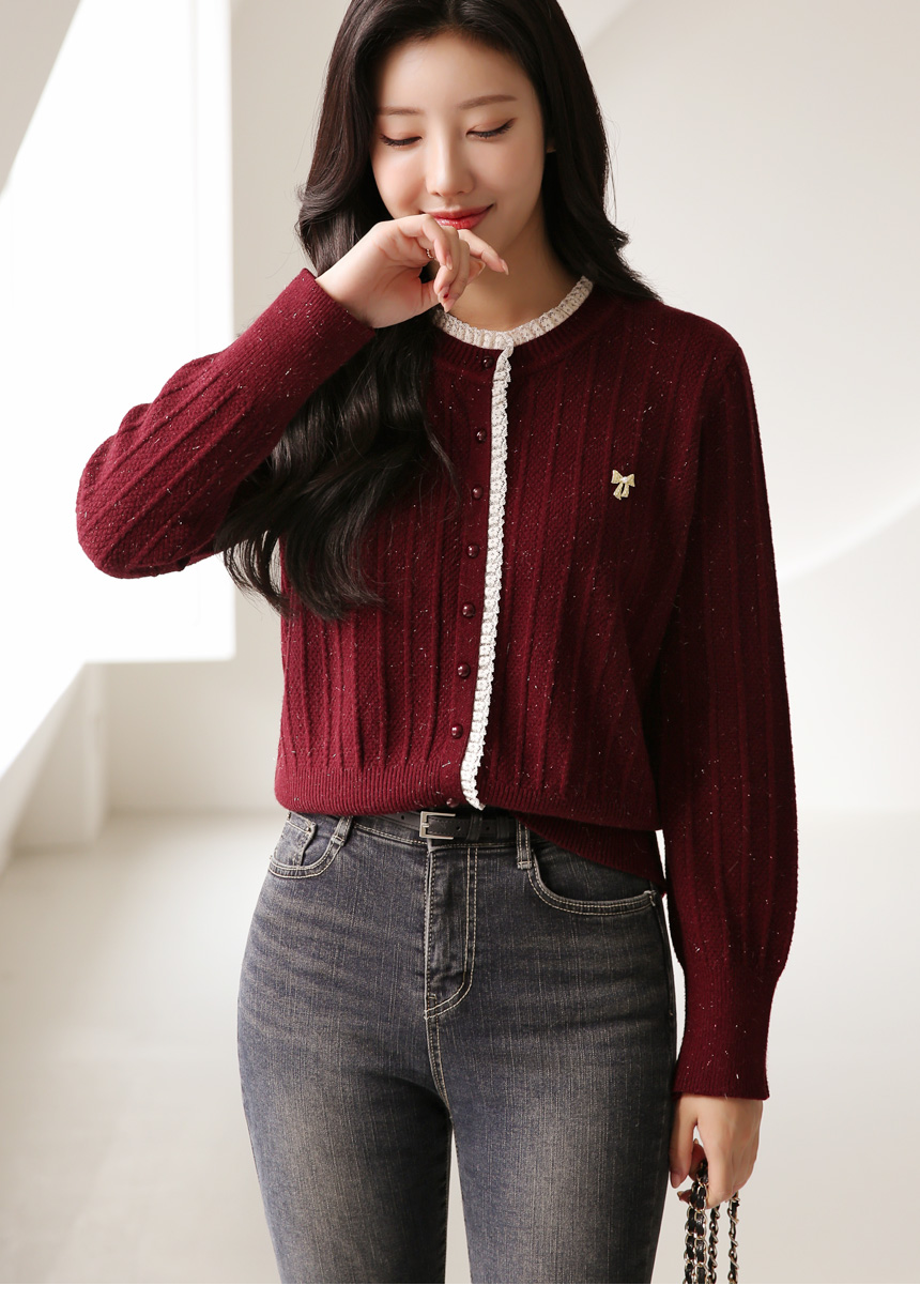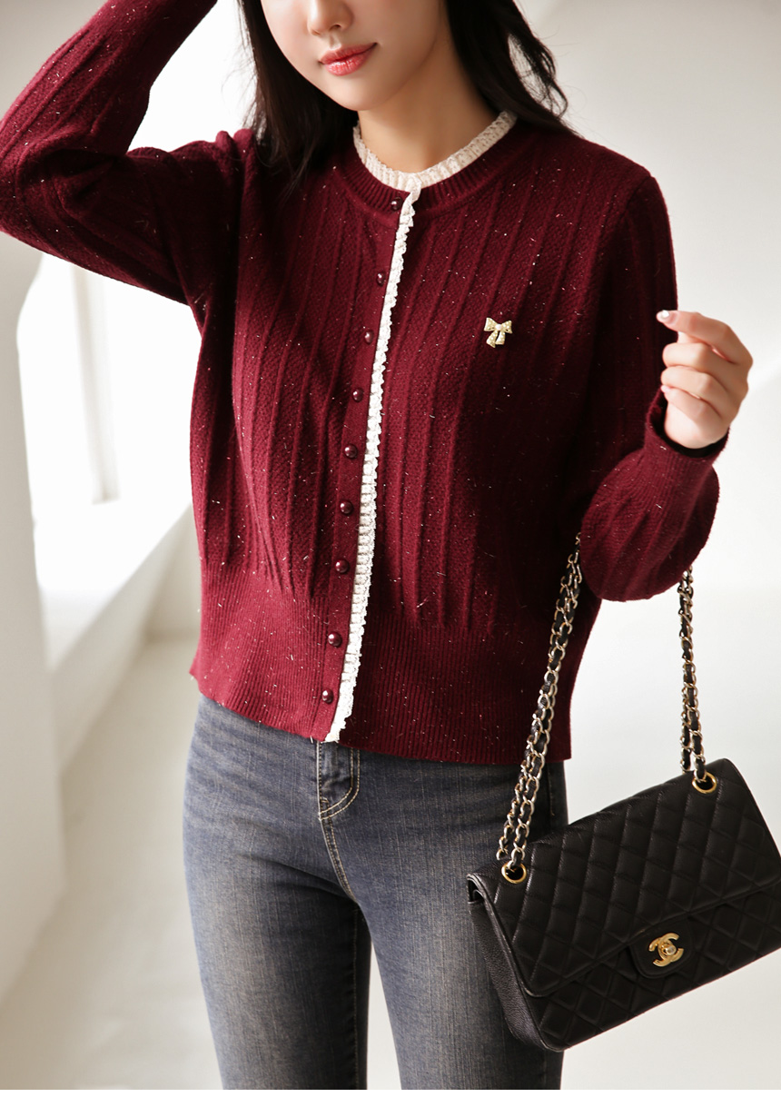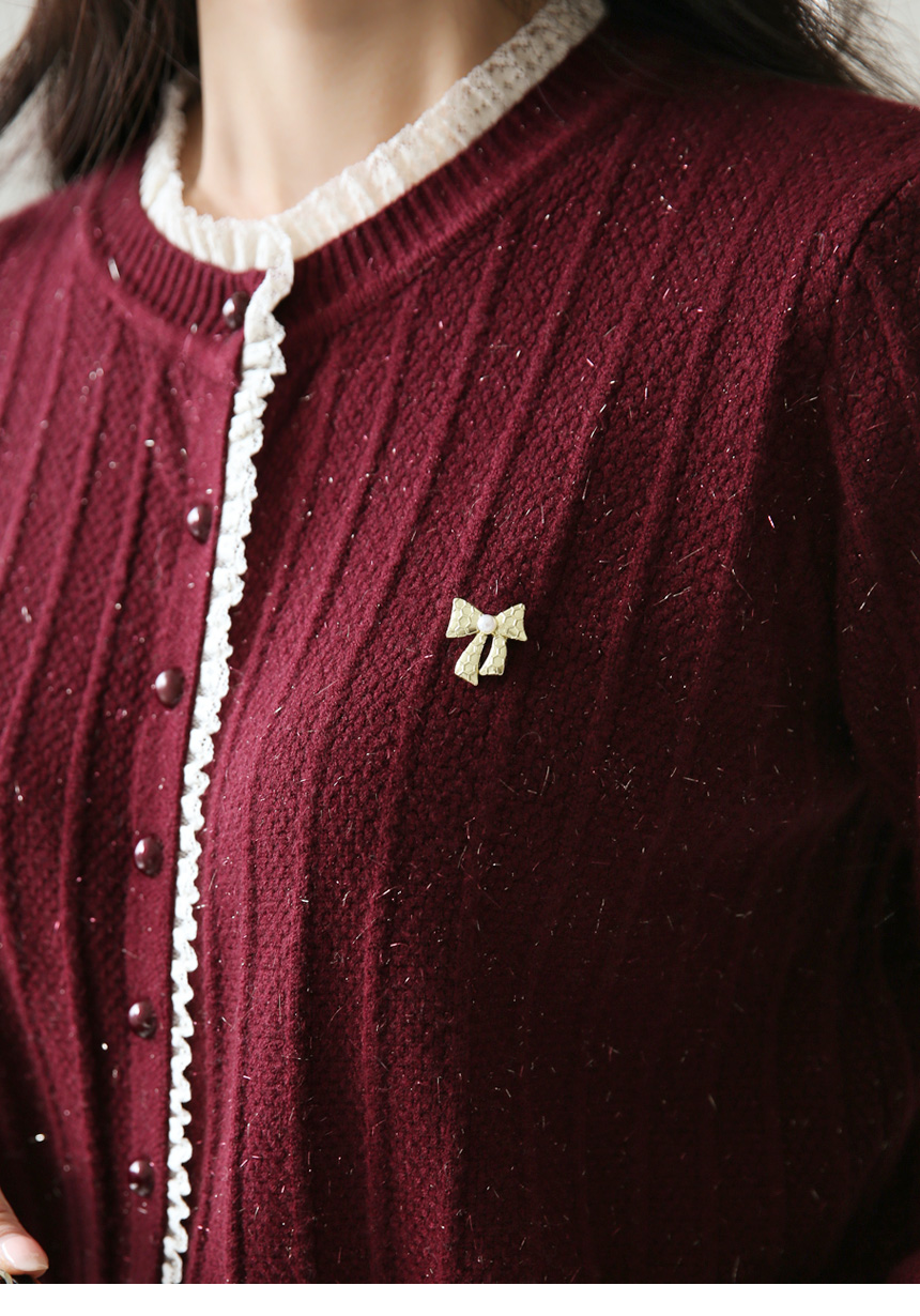 르펠 리본 브로치 펄 블렌딩 레이스 트리밍 니트 가디건