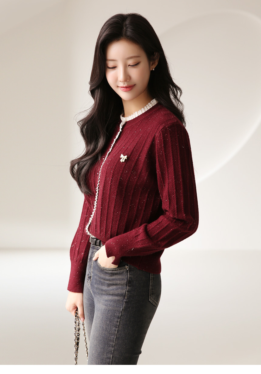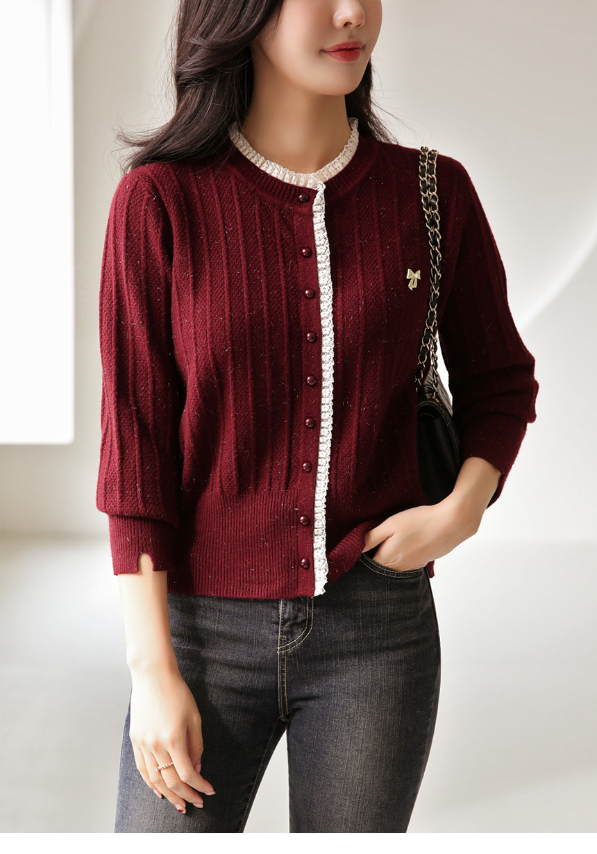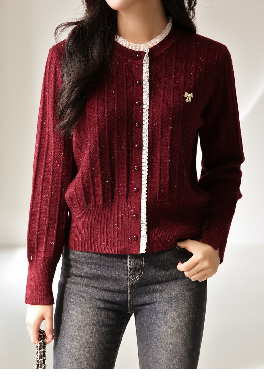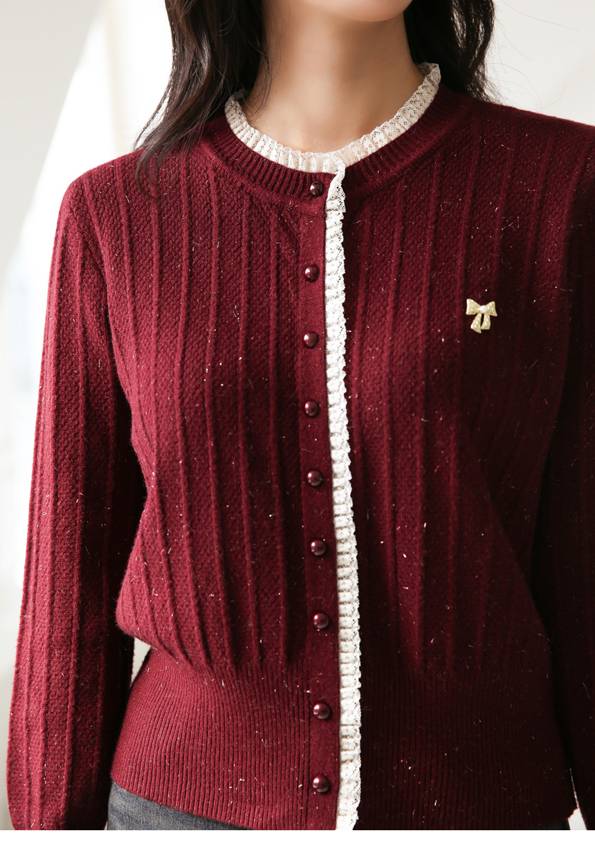 르펠 리본 브로치 펄 블렌딩 레이스 트리밍 니트 가디건