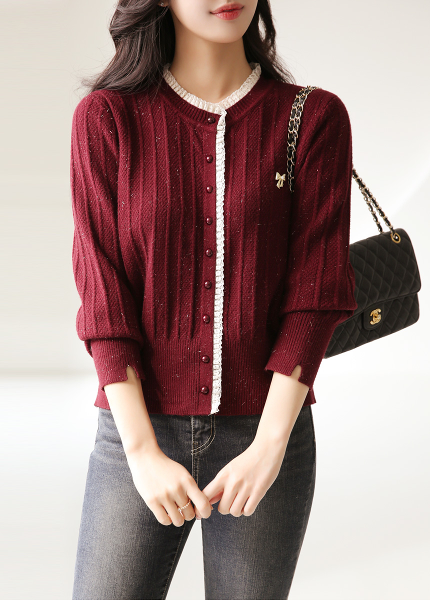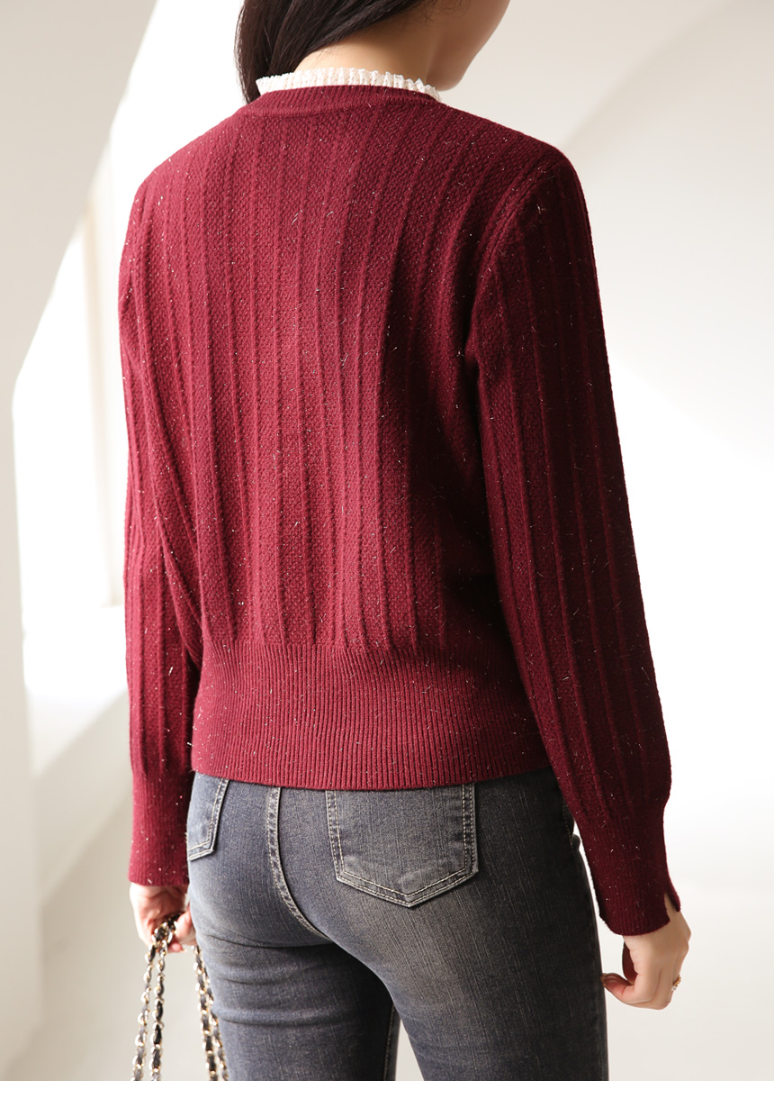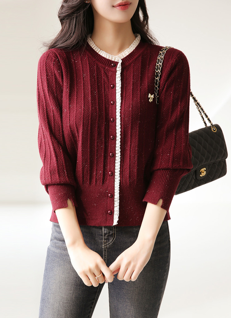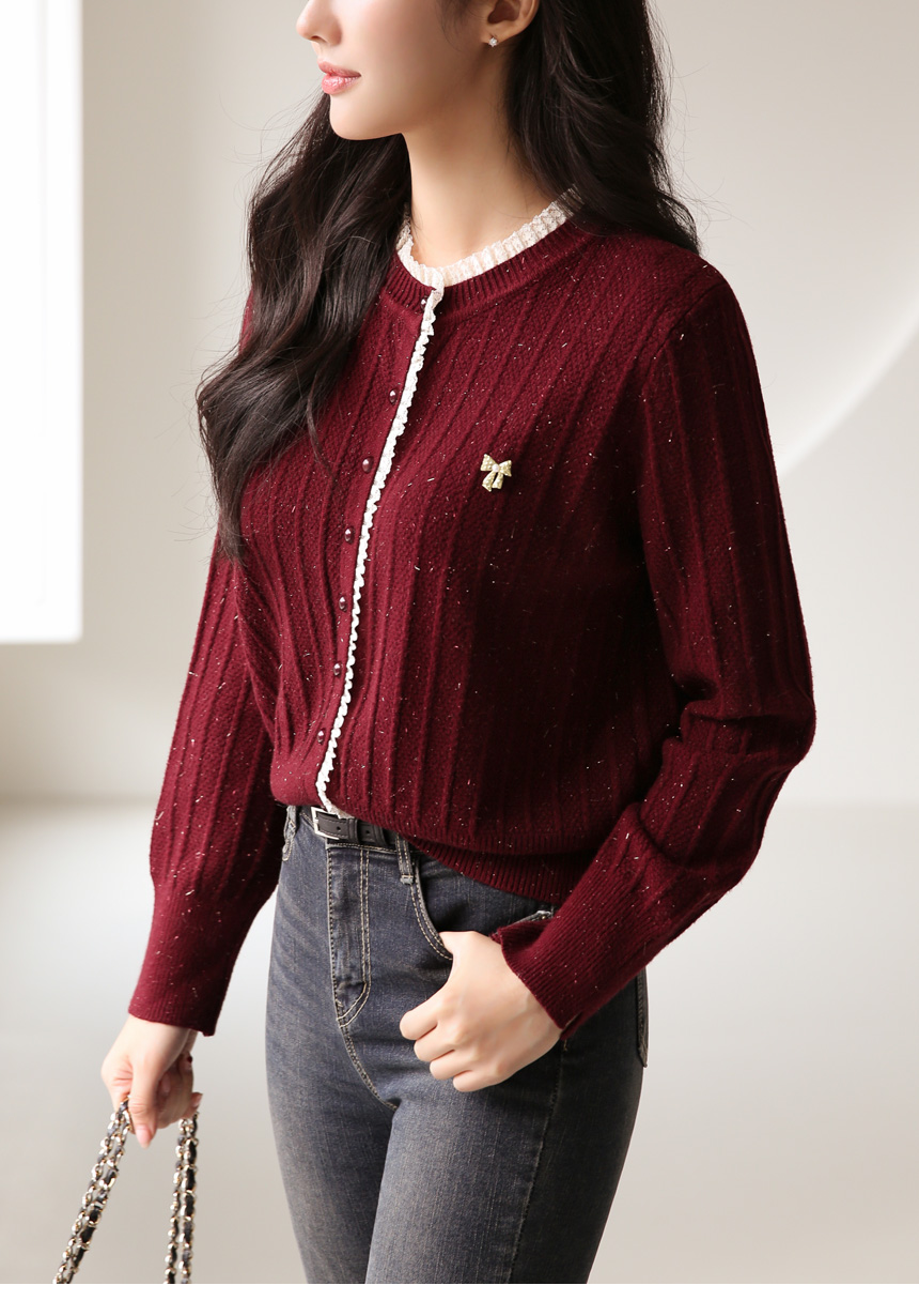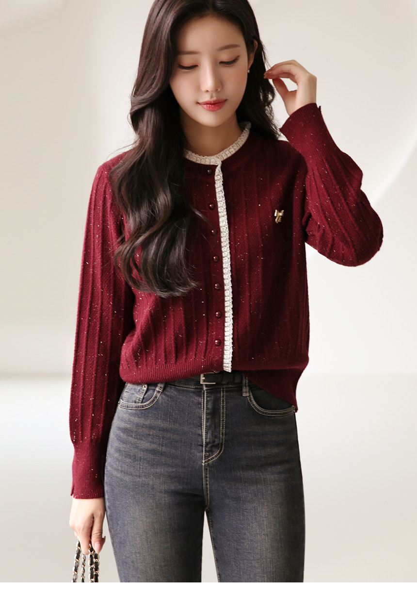 르펠 리본 브로치 펄 블렌딩 레이스 트리밍 니트 가디건